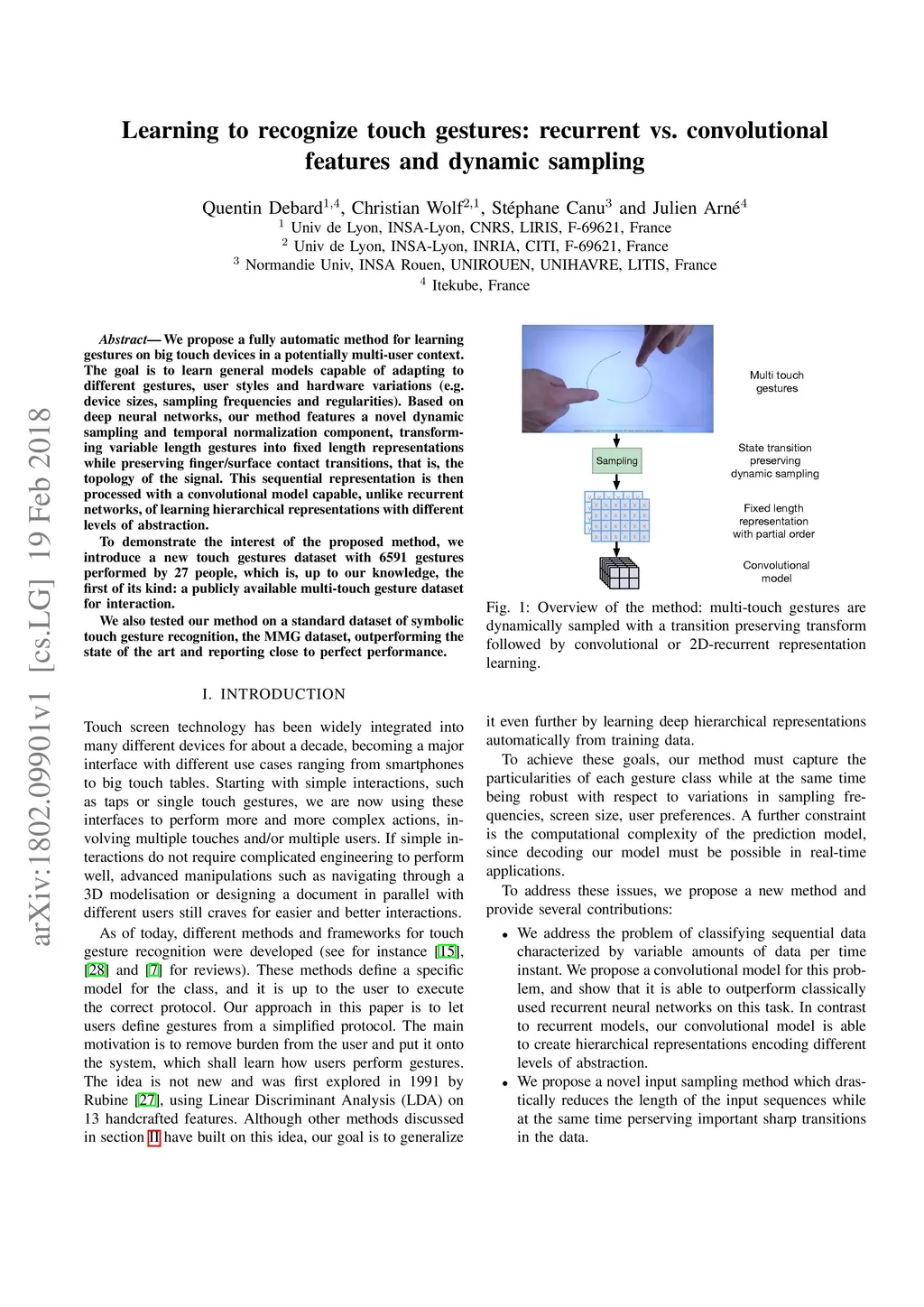 We propose a fully automatic method for learning gestures on big touch devices in a potentially multi-user context. The goal is to learn general models capable of adapting to different gestures, user styles and hardware variations (e.g. device sizes, sampling frequencies and regularities). Based on deep neural networks, our method features a novel dynamic sampling and temporal normalization component, transforming variable length gestures into fixed length representations while preserving finger/surface contact transitions, that is, the topology of the signal. This sequential representation is then processed with a convolutional model capable, unlike recurrent networks, of learning hierarchical representations with different levels of abstraction. To demonstrate the interest of the proposed method, we introduce a new touch gestures dataset with 6591 gestures performed by 27 people, which is, up to our knowledge, the first of its kind: a publicly available multi-touch gesture dataset for interaction. We also tested our method on a standard dataset of symbolic touch gesture recognition, the MMG dataset, outperforming the state of the art and reporting close to perfect performance.