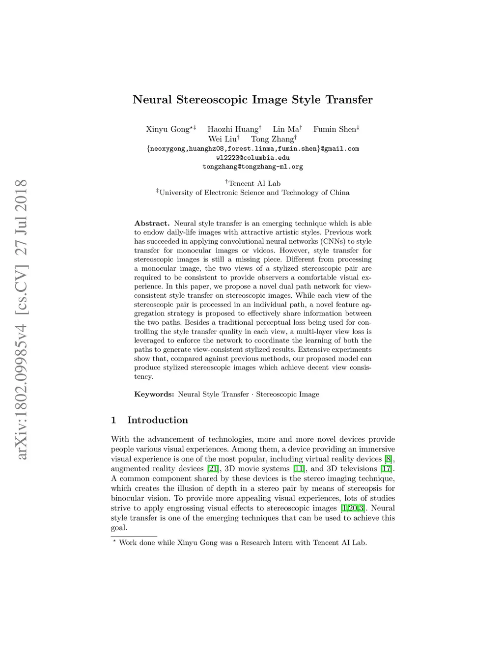 Neural style transfer is an emerging technique which is able to endow daily-life images with attractive artistic styles. Previous work has succeeded in applying convolutional neural networks (CNNs) to style transfer for monocular images or videos. However, style transfer for stereoscopic images is still a missing piece. Different from processing a monocular image, the two views of a stylized stereoscopic pair are required to be consistent to provide observers a comfortable visual experience. In this paper, we propose a novel dual path network for view-consistent style transfer on stereoscopic images. While each view of the stereoscopic pair is processed in an individual path, a novel feature aggregation strategy is proposed to effectively share information between the two paths. Besides a traditional perceptual loss being used for controlling the style transfer quality in each view, a multi-layer view loss is leveraged to enforce the network to coordinate the learning of both the paths to generate view-consistent stylized results. Extensive experiments show that, compared against previous methods, our proposed model can produce stylized stereoscopic images which achieve decent view consistency.