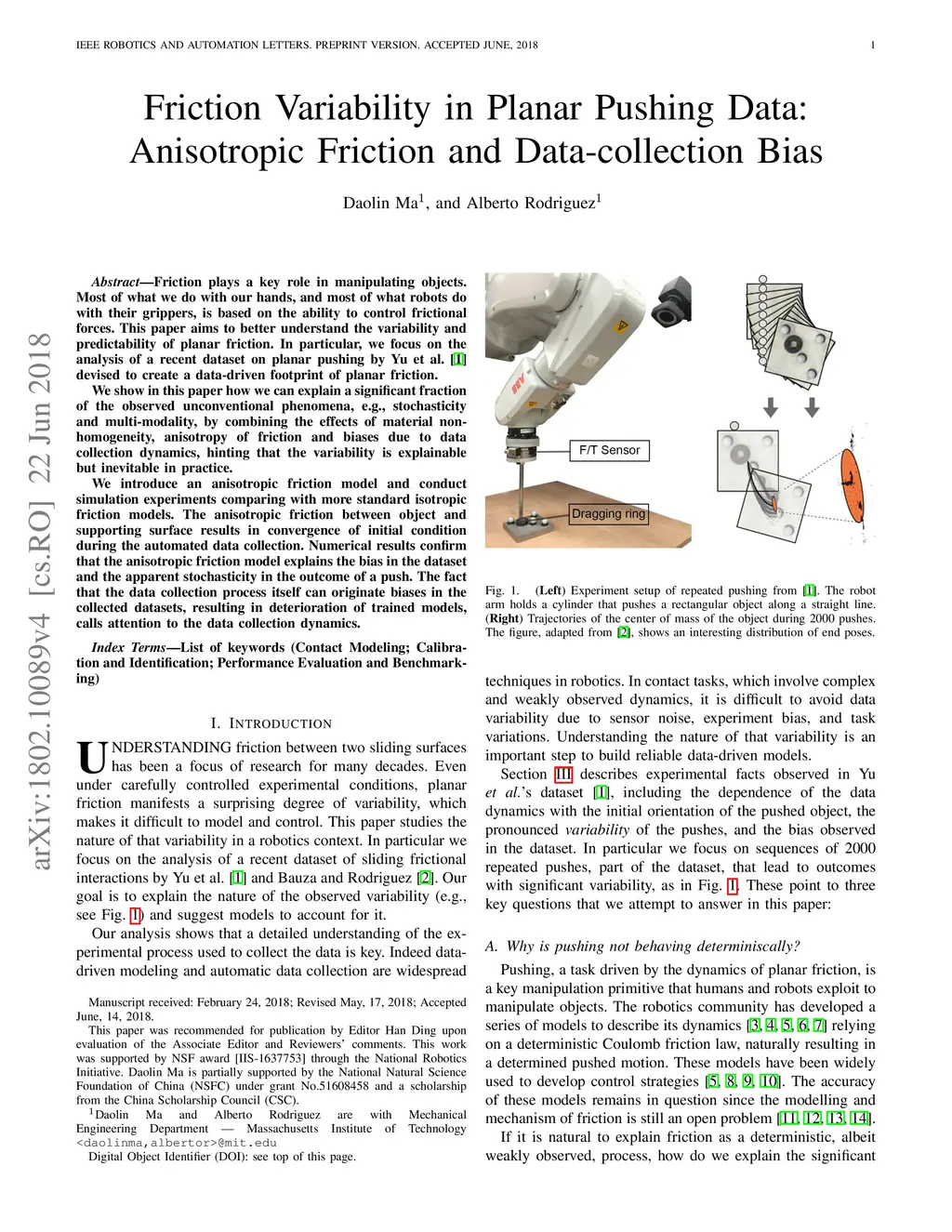 Friction plays a key role in manipulating objects. Most of what we do with our hands, and most of what robots do with their grippers, is based on the ability to control frictional forces. This paper aims to better understand the variability and predictability of planar friction. In particular, we focus on the analysis of a recent dataset on planar pushing by Yu et al. [1] devised to create a data-driven footprint of planar friction. We show in this paper how we can explain a significant fraction of the observed unconventional phenomena, e.g., stochasticity and multi-modality, by combining the effects of material non-homogeneity, anisotropy of friction and biases due to data collection dynamics, hinting that the variability is explainable but inevitable in practice. We introduce an anisotropic friction model and conduct simulation experiments comparing with more standard isotropic friction models. The anisotropic friction between object and supporting surface results in convergence of initial condition during the automated data collection. Numerical results confirm that the anisotropic friction model explains the bias in the dataset and the apparent stochasticity in the outcome of a push. The fact that the data collection process itself can originate biases in the collected datasets, resulting in deterioration of trained models, calls attention to the data collection dynamics.