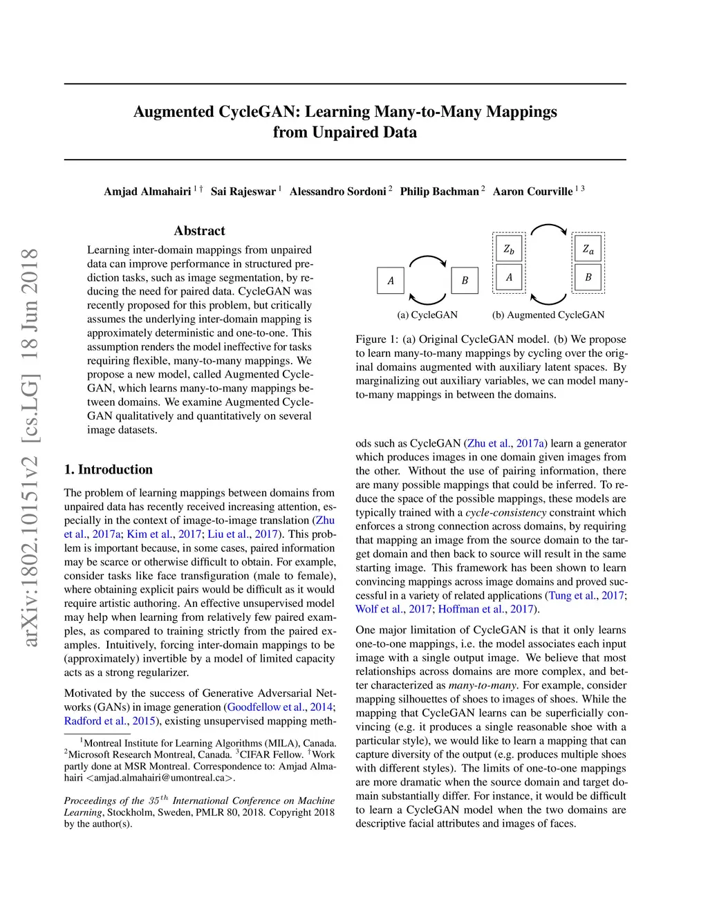 Learning inter-domain mappings from unpaired data can improve performance in structured prediction tasks, such as image segmentation, by reducing the need for paired data. CycleGAN was recently proposed for this problem, but critically assumes the underlying inter-domain mapping is approximately deterministic and one-to-one. This assumption renders the model ineffective for tasks requiring flexible, many-to-many mappings. We propose a new model, called Augmented CycleGAN, which learns many-to-many mappings between domains. We examine Augmented CycleGAN qualitatively and quantitatively on several image datasets.