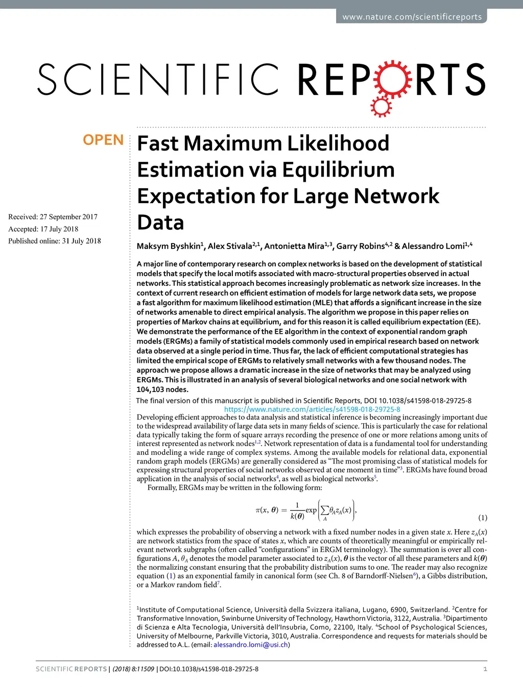 A major line of contemporary research on complex networks is based on the development of statistical models that specify the local motifs associated with macro-structural properties observed in actual networks. This statistical approach becomes increasingly problematic as network size increases. In the context of current research on efficient estimation of models for large network data sets, we propose a fast algorithm for maximum likelihood estimation (MLE) that afords a signifcant increase in the size of networks amenable to direct empirical analysis. The algorithm we propose in this paper relies on properties of Markov chains at equilibrium, and for this reason it is called equilibrium expectation (EE). We demonstrate the performance of the EE algorithm in the context of exponential random graphmodels (ERGMs) a family of statistical models commonly used in empirical research based on network data observed at a single period in time. Thus far, the lack of efcient computational strategies has limited the empirical scope of ERGMs to relatively small networks with a few thousand nodes. The approach we propose allows a dramatic increase in the size of networks that may be analyzed using ERGMs. This is illustrated in an analysis of several biological networks and one social network with 104,103 nodes