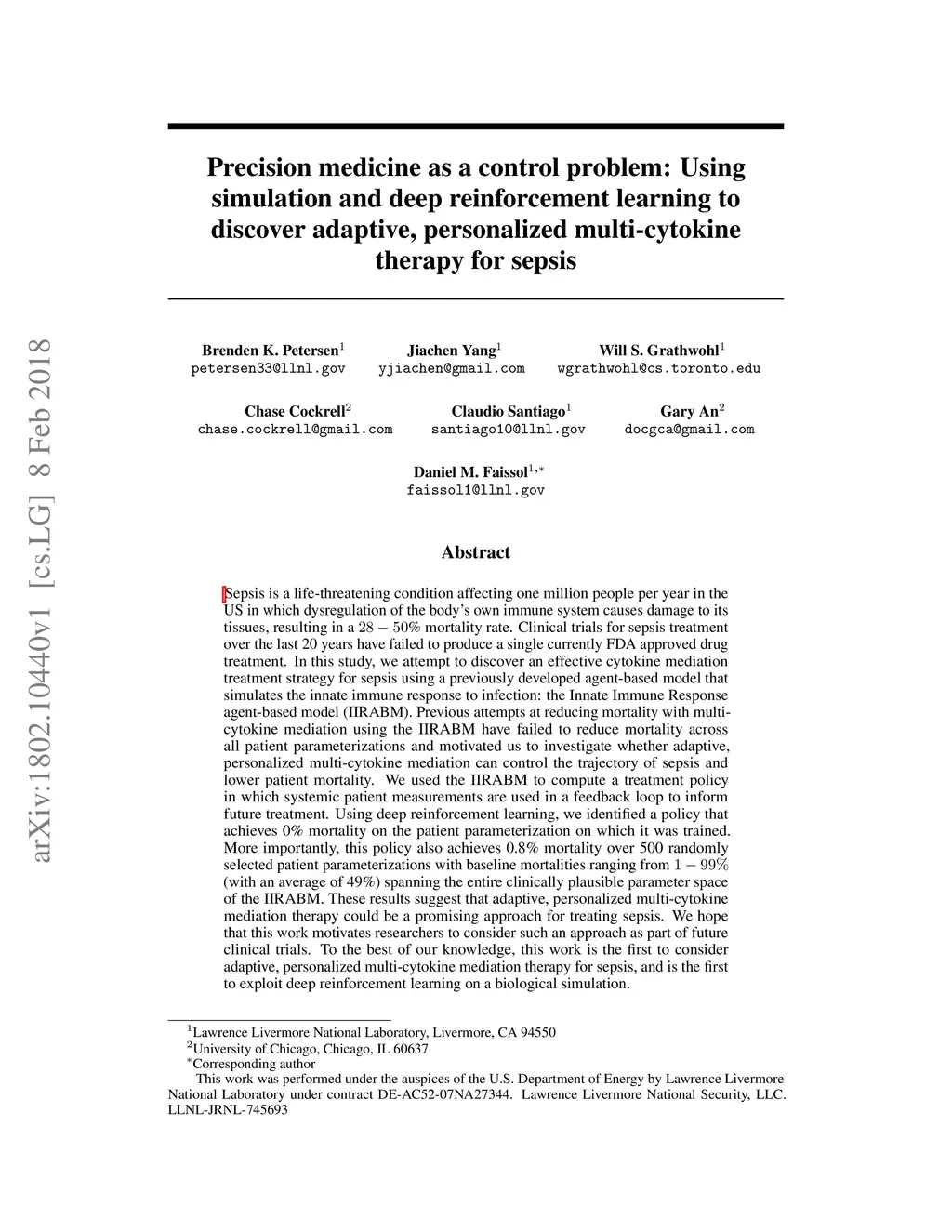 Sepsis is a life-threatening condition affecting one million people per year in the US in which dysregulation of the body's own immune system causes damage to its tissues, resulting in a 28 - 50% mortality rate. Clinical trials for sepsis treatment over the last 20 years have failed to produce a single currently FDA approved drug treatment. In this study, we attempt to discover an effective cytokine mediation treatment strategy for sepsis using a previously developed agent-based model that simulates the innate immune response to infection: the Innate Immune Response agent-based model (IIRABM). Previous attempts at reducing mortality with multi-cytokine mediation using the IIRABM have failed to reduce mortality across all patient parameterizations and motivated us to investigate whether adaptive, personalized multi-cytokine mediation can control the trajectory of sepsis and lower patient mortality. We used the IIRABM to compute a treatment policy in which systemic patient measurements are used in a feedback loop to inform future treatment. Using deep reinforcement learning, we identified a policy that achieves 0% mortality on the patient parameterization on which it was trained. More importantly, this policy also achieves 0.8% mortality over 500 randomly selected patient parameterizations with baseline mortalities ranging from 1 - 99% (with an average of 49%) spanning the entire clinically plausible parameter space of the IIRABM. These results suggest that adaptive, personalized multi-cytokine mediation therapy could be a promising approach for treating sepsis. We hope that this work motivates researchers to consider such an approach as part of future clinical trials. To the best of our knowledge, this work is the first to consider adaptive, personalized multi-cytokine mediation therapy for sepsis, and is the first to exploit deep reinforcement learning on a biological simulation.