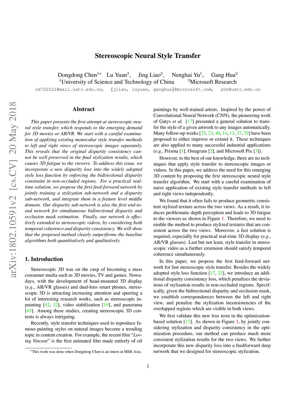 Stereoscopic Neural Style Transfer