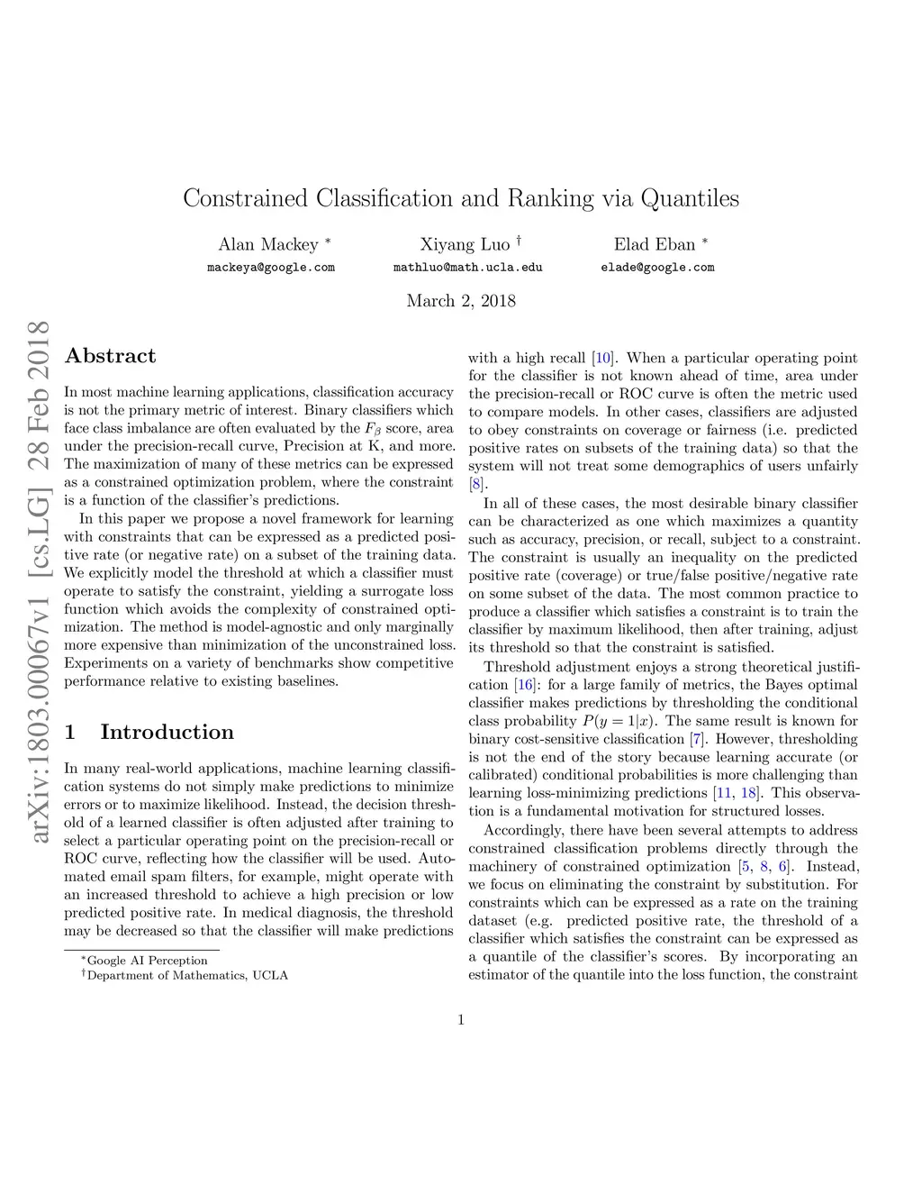 Constrained Classification and Ranking via Quantiles