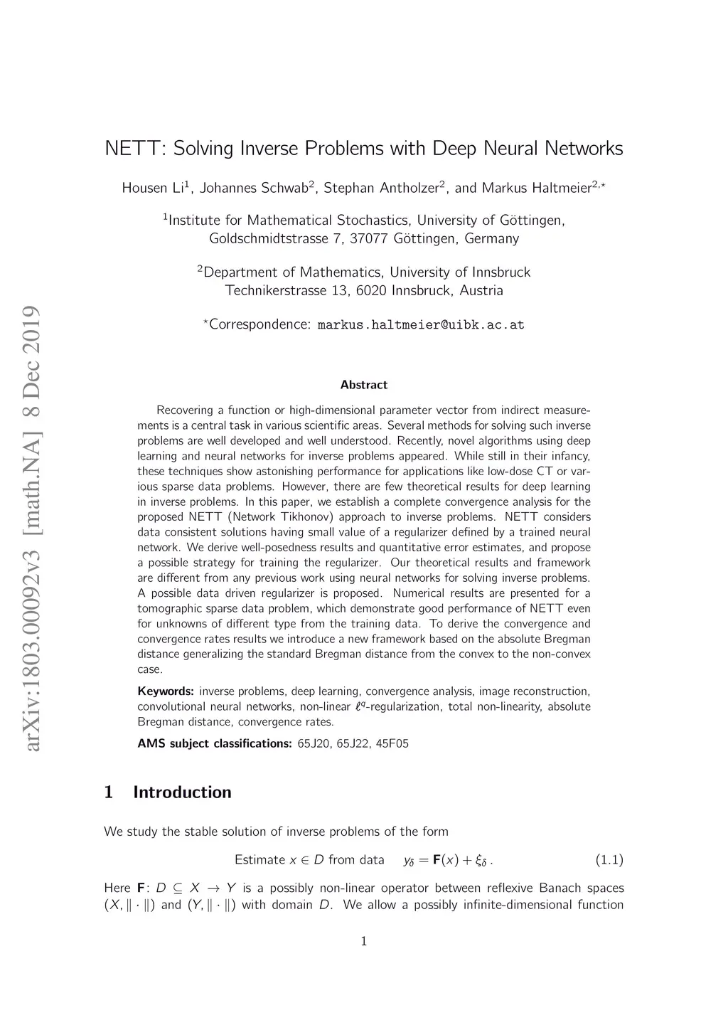 NETT: Solving Inverse Problems with Deep Neural Networks