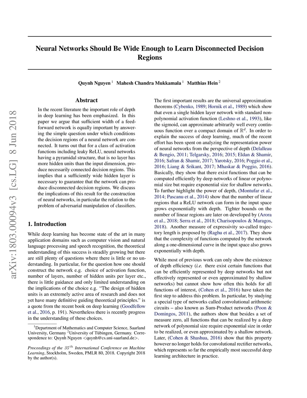 In the recent literature the important role of depth in deep learning has been emphasized. In this paper we argue that sufficient width of a feedforward network is equally important by answering the simple question under which conditions the decision regions of a neural network are connected. It turns out that for a class of activation functions including leaky ReLU, neural networks having a pyramidal structure, that is no layer has more hidden units than the input dimension, produce necessarily connected decision regions. This implies that a sufficiently wide hidden layer is necessary to guarantee that the network can produce disconnected decision regions. We discuss the implications of this result for the construction of neural networks, in particular the relation to the problem of adversarial manipulation of classifiers.