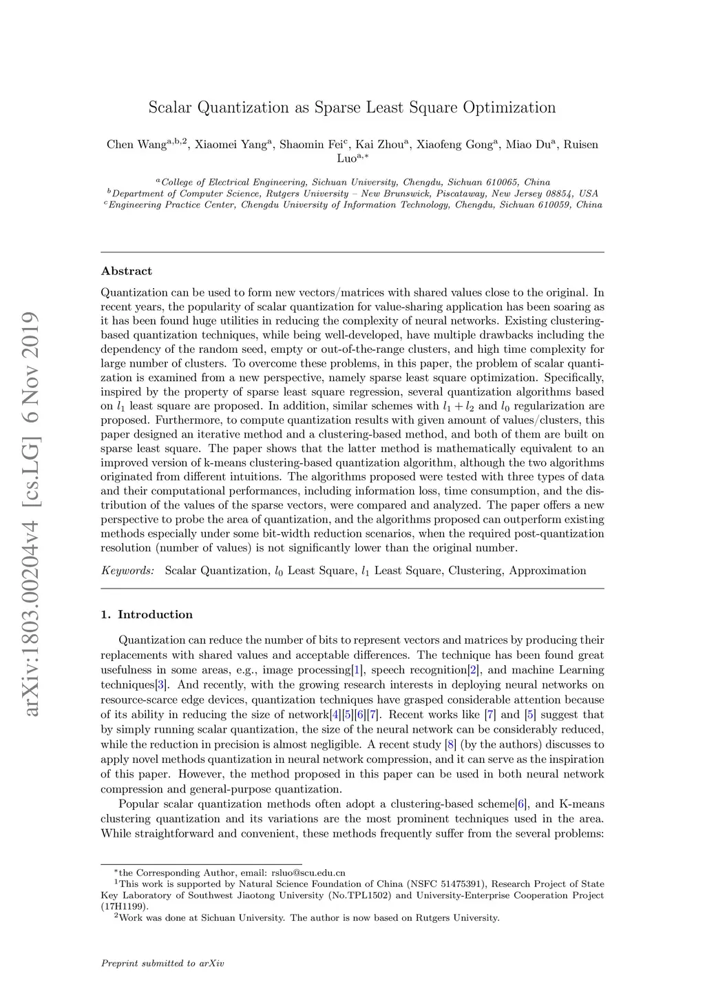 Quantization can be used to form new vectors/matrices with shared values close to the original. In recent years, the popularity of scalar quantization for value-sharing applications has been soaring as it has been found huge utilities in reducing the complexity of neural networks. Existing clustering-based quantization techniques, while being well-developed, have multiple drawbacks including the dependency of the random seed, empty or out-of-the-range clusters, and high time complexity for a large number of clusters. To overcome these problems, in this paper, the problem of scalar quantization is examined from a new perspective, namely sparse least square optimization. Specifically, inspired by the property of sparse least square regression, several quantization algorithms based on least square are proposed. In addition, similar schemes with and regularization are proposed. Furthermore, to compute quantization results with a given amount of values/clusters, this paper designed an iterative method and a clustering-based method, and both of them are built on sparse least square. The paper shows that the latter method is mathematically equivalent to an improved version of k-means clustering-based quantization algorithm, although the two algorithms originated from different intuitions. The algorithms proposed were tested with three types of data and their computational performances, including information loss, time consumption, and the distribution of the values of the sparse vectors, were compared and analyzed. The paper offers a new perspective to probe the area of quantization, and the algorithms proposed can outperform existing methods especially under some bit-width reduction scenarios, when the required post-quantization resolution (number of values) is not significantly lower than the original number.
