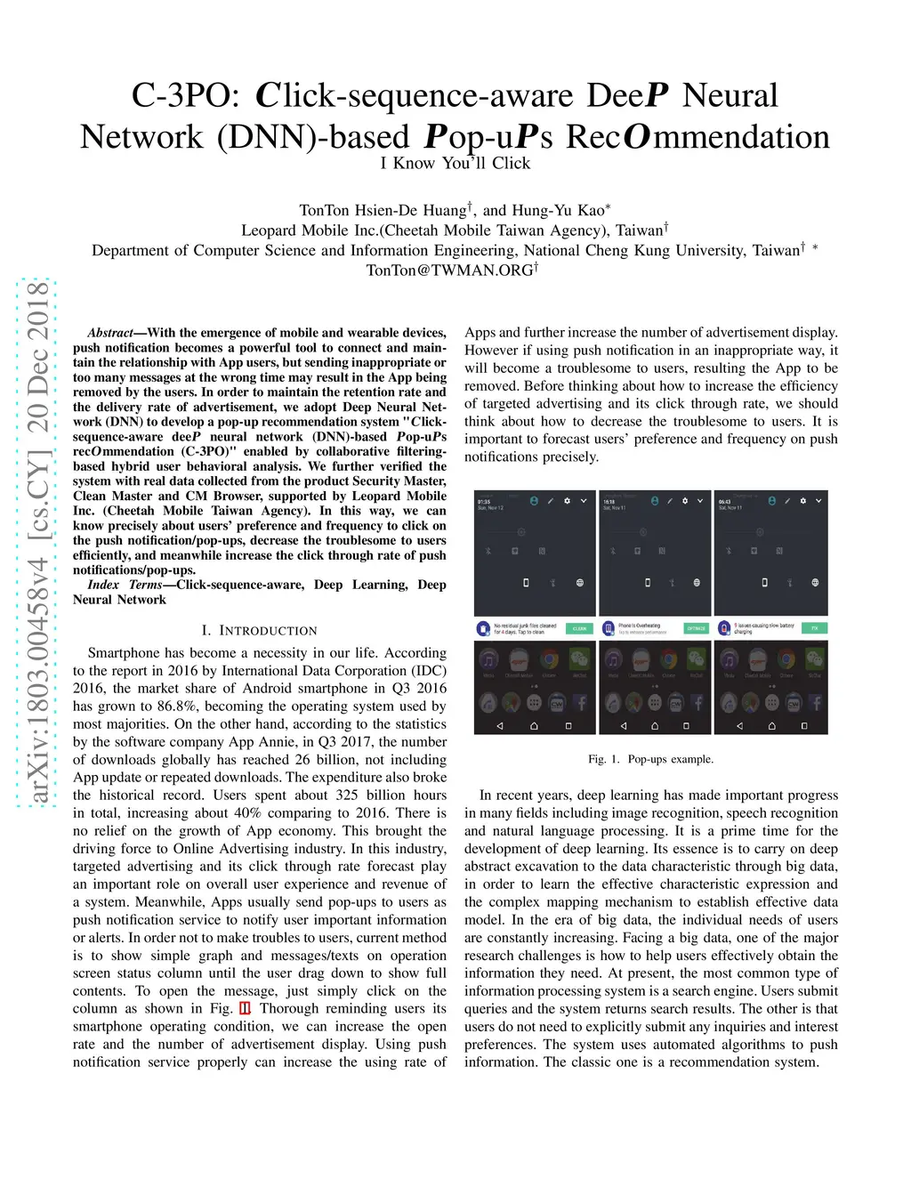 With the emergence of mobile and wearable devices, push notification becomes a powerful tool to connect and maintain the relationship with App users, but sending inappropriate or too many messages at the wrong time may result in the App being removed by the users. In order to maintain the retention rate and the delivery rate of advertisement, we adopt Deep Neural Network (DNN) to develop a pop-up recommendation system "Click sequence-aware deeP neural network (DNN)-based Pop-uPs recOmmendation (C-3PO)" enabled by collaborative filtering-based hybrid user behavioral analysis. We further verified the system with real data collected from the product Security Master, Clean Master and CM Browser, supported by Leopard Mobile Inc. (Cheetah Mobile Taiwan Agency). In this way, we can know precisely about users' preference and frequency to click on the push notification/pop-ups, decrease the troublesome to users efficiently, and meanwhile increase the click through rate of push notifications/pop-ups.