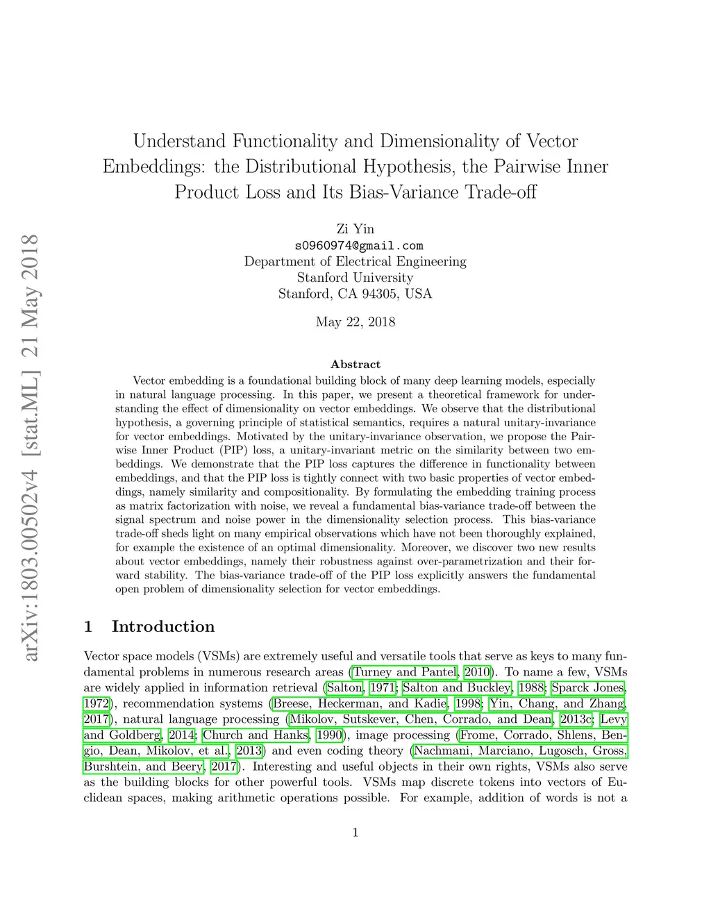 Vector embedding is a foundational building block of many deep learning models, especially in natural language processing. In this paper, we present a theoretical framework for understanding the effect of dimensionality on vector embeddings. We observe that the distributional hypothesis, a governing principle of statistical semantics, requires a natural unitary-invariance for vector embeddings. Motivated by the unitary-invariance observation, we propose the Pairwise Inner Product (PIP) loss, a unitary-invariant metric on the similarity between two embeddings. We demonstrate that the PIP loss captures the difference in functionality between embeddings, and that the PIP loss is tightly connect with two basic properties of vector embeddings, namely similarity and compositionality. By formulating the embedding training process as matrix factorization with noise, we reveal a fundamental bias-variance trade-off between the signal spectrum and noise power in the dimensionality selection process. This bias-variance trade-off sheds light on many empirical observations which have not been thoroughly explained, for example the existence of an optimal dimensionality. Moreover, we discover two new results about vector embeddings, namely their robustness against over-parametrization and their forward stability. The bias-variance trade-off of the PIP loss explicitly answers the fundamental open problem of dimensionality selection for vector embeddings.