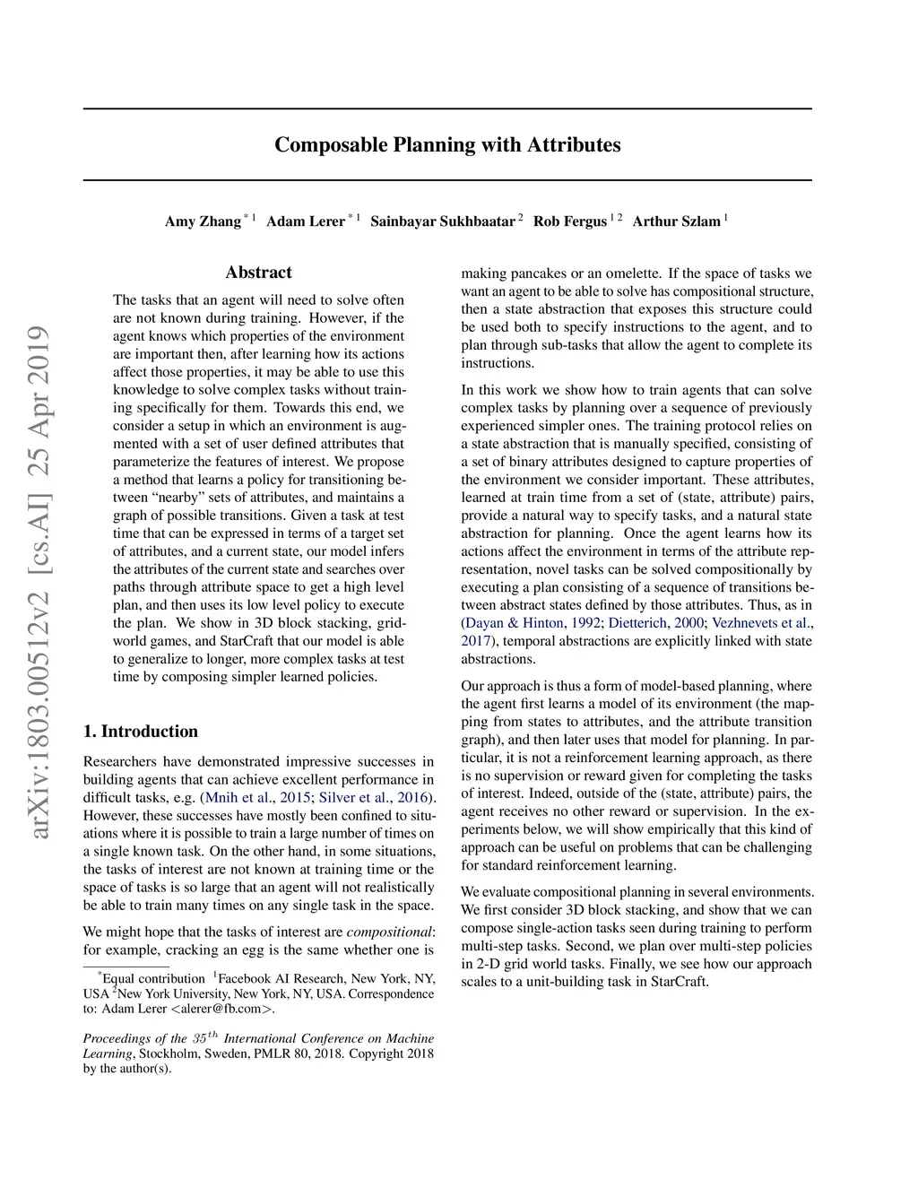 The tasks that an agent will need to solve often are not known during training. However, if the agent knows which properties of the environment are important then, after learning how its actions affect those properties, it may be able to use this knowledge to solve complex tasks without training specifically for them. Towards this end, we consider a setup in which an environment is augmented with a set of user defined attributes that parameterize the features of interest. We propose a method that learns a policy for transitioning between "nearby" sets of attributes, and maintains a graph of possible transitions. Given a task at test time that can be expressed in terms of a target set of attributes, and a current state, our model infers the attributes of the current state and searches over paths through attribute space to get a high level plan, and then uses its low level policy to execute the plan. We show in 3D block stacking, grid-world games, and StarCraft that our model is able to generalize to longer, more complex tasks at test time by composing simpler learned policies.
