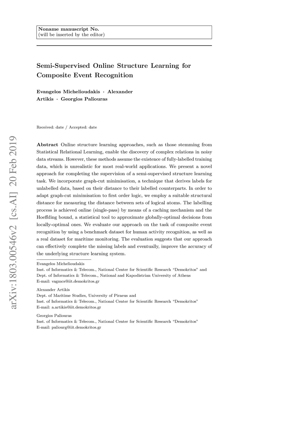 Online structure learning approaches, such as those stemming from Statistical Relational Learning, enable the discovery of complex relations in noisy data streams. However, these methods assume the existence of fully-labelled training data, which is unrealistic for most real-world applications. We present a novel approach for completing the supervision of a semi-supervised structure learning task. We incorporate graph-cut minimisation, a technique that derives labels for unlabelled data, based on their distance to their labelled counterparts. In order to adapt graph-cut minimisation to first order logic, we employ a suitable structural distance for measuring the distance between sets of logical atoms. The labelling process is achieved online (single-pass) by means of a caching mechanism and the Hoeffding bound, a statistical tool to approximate globally-optimal decisions from locally-optimal ones. We evaluate our approach on the task of composite event recognition by using a benchmark dataset for human activity recognition, as well as a real dataset for maritime monitoring. The evaluation suggests that our approach can effectively complete the missing labels and eventually, improve the accuracy of the underlying structure learning system.