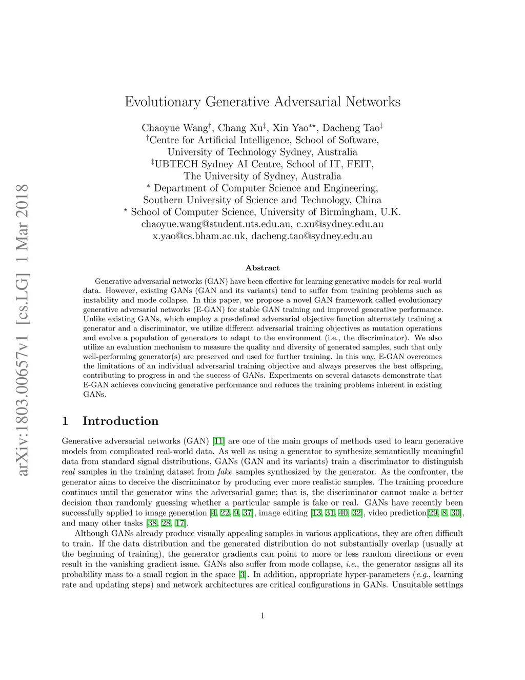 Generative adversarial networks (GAN) have been effective for learning generative models for real-world data. However, existing GANs (GAN and its variants) tend to suffer from training problems such as instability and mode collapse. In this paper, we propose a novel GAN framework called evolutionary generative adversarial networks (E-GAN) for stable GAN training and improved generative performance. Unlike existing GANs, which employ a pre-defined adversarial objective function alternately training a generator and a discriminator, we utilize different adversarial training objectives as mutation operations and evolve a population of generators to adapt to the environment (i.e., the discriminator). We also utilize an evaluation mechanism to measure the quality and diversity of generated samples, such that only well-performing generator(s) are preserved and used for further training. In this way, E-GAN overcomes the limitations of an individual adversarial training objective and always preserves the best offspring, contributing to progress in and the success of GANs. Experiments on several datasets demonstrate that E-GAN achieves convincing generative performance and reduces the training problems inherent in existing GANs.