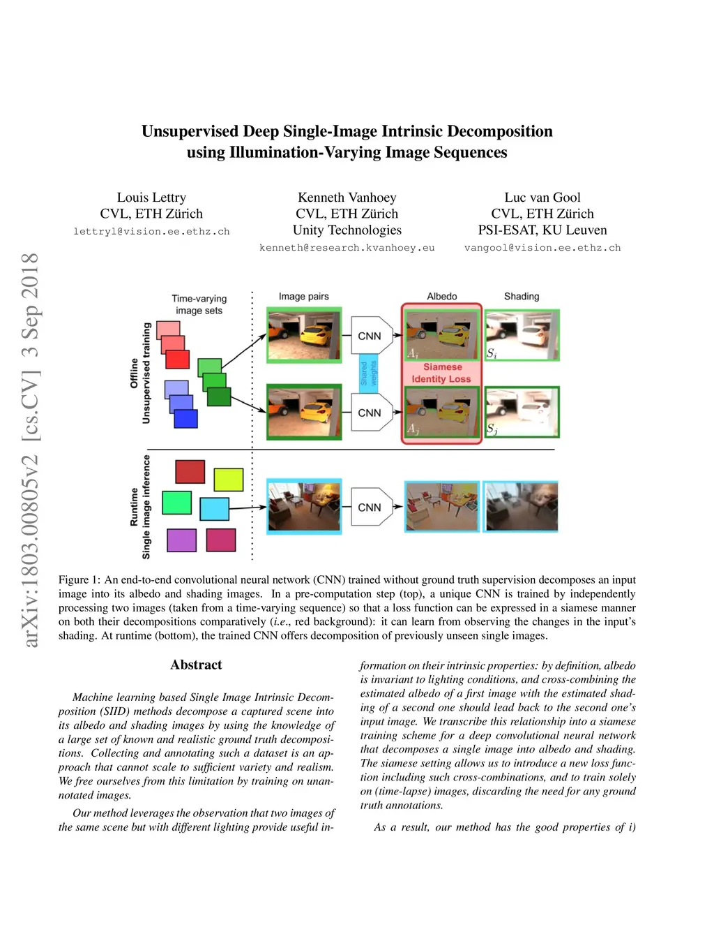 Machine learning based Single Image Intrinsic Decomposition (SIID) methods decompose a captured scene into its albedo and shading images by using the knowledge of a large set of known and realistic ground truth decompositions. Collecting and annotating such a dataset is an approach that cannot scale to sufficient variety and realism. We free ourselves from this limitation by training on unannotated images. Our method leverages the observation that two images of the same scene but with different lighting provide useful information on their intrinsic properties: by definition, albedo is invariant to lighting conditions, and cross-combining the estimated albedo of a first image with the estimated shading of a second one should lead back to the second one's input image. We transcribe this relationship into a siamese training scheme for a deep convolutional neural network that decomposes a single image into albedo and shading. The siamese setting allows us to introduce a new loss function including such cross-combinations, and to train solely on (time-lapse) images, discarding the need for any ground truth annotations. As a result, our method has the good properties of i) taking advantage of the time-varying information of image sequences in the (pre-computed) training step, ii) not requiring ground truth data to train on, and iii) being able to decompose single images of unseen scenes at runtime. To demonstrate and evaluate our work, we additionally propose a new rendered dataset containing illumination-varying scenes and a set of quantitative metrics to evaluate SIID algorithms. Despite its unsupervised nature, our results compete with state of the art methods, including supervised and non data-driven methods.