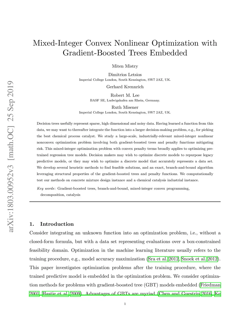 Decision trees usefully represent sparse, high dimensional and noisy data. Having learned a function from this data, we may want to thereafter integrate the function into a larger decision-making problem, e.g., for picking the best chemical process catalyst. We study a large-scale, industrially-relevant mixed-integer nonlinear nonconvex optimization problem involving both gradient-boosted trees and penalty functions mitigating risk. This mixed-integer optimization problem with convex penalty terms broadly applies to optimizing pre-trained regression tree models. Decision makers may wish to optimize discrete models to repurpose legacy predictive models, or they may wish to optimize a discrete model that particularly well-represents a data set. We develop several heuristic methods to find feasible solutions, and an exact, branch-and-bound algorithm leveraging structural properties of the gradient-boosted trees and penalty functions. We computationally test our methods on concrete mixture design instance and a chemical catalysis industrial instance.