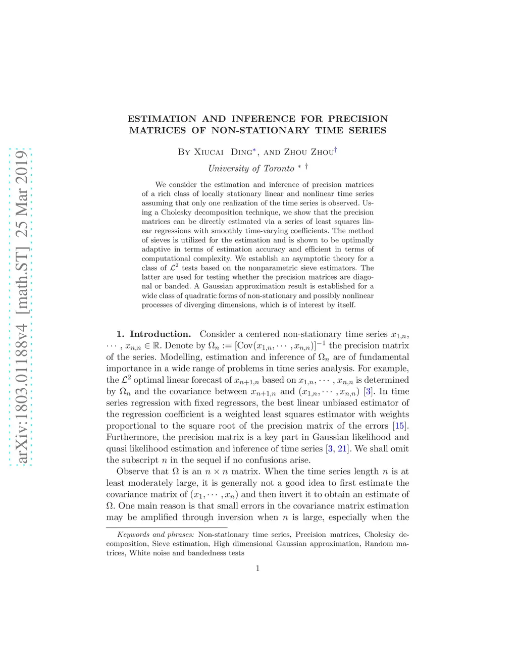 In this paper, we consider the estimation and inference of precision matrices of a rich class of locally stationary and nonlinear time series assuming that only one realization of the time series is observed. Using a Cholesky decomposition technique, we show that the precision matrices can be directly estimated via a series of least squares linear regressions with smoothly time-varying coefficients. The method of sieves is utilized for the estimation and is shown to be efficient and optimally adaptive in terms of estimation accuracy and computational complexity. We establish an asymptotic theory for a class of tests based on the nonparametric sieve estimators. The latter are used for testing whether the precision matrices are diagonal or banded. A high dimensional Gaussian approximation result is established for a wide class of quadratic form of non-stationary and nonlinear processes, which is of interest by itself.