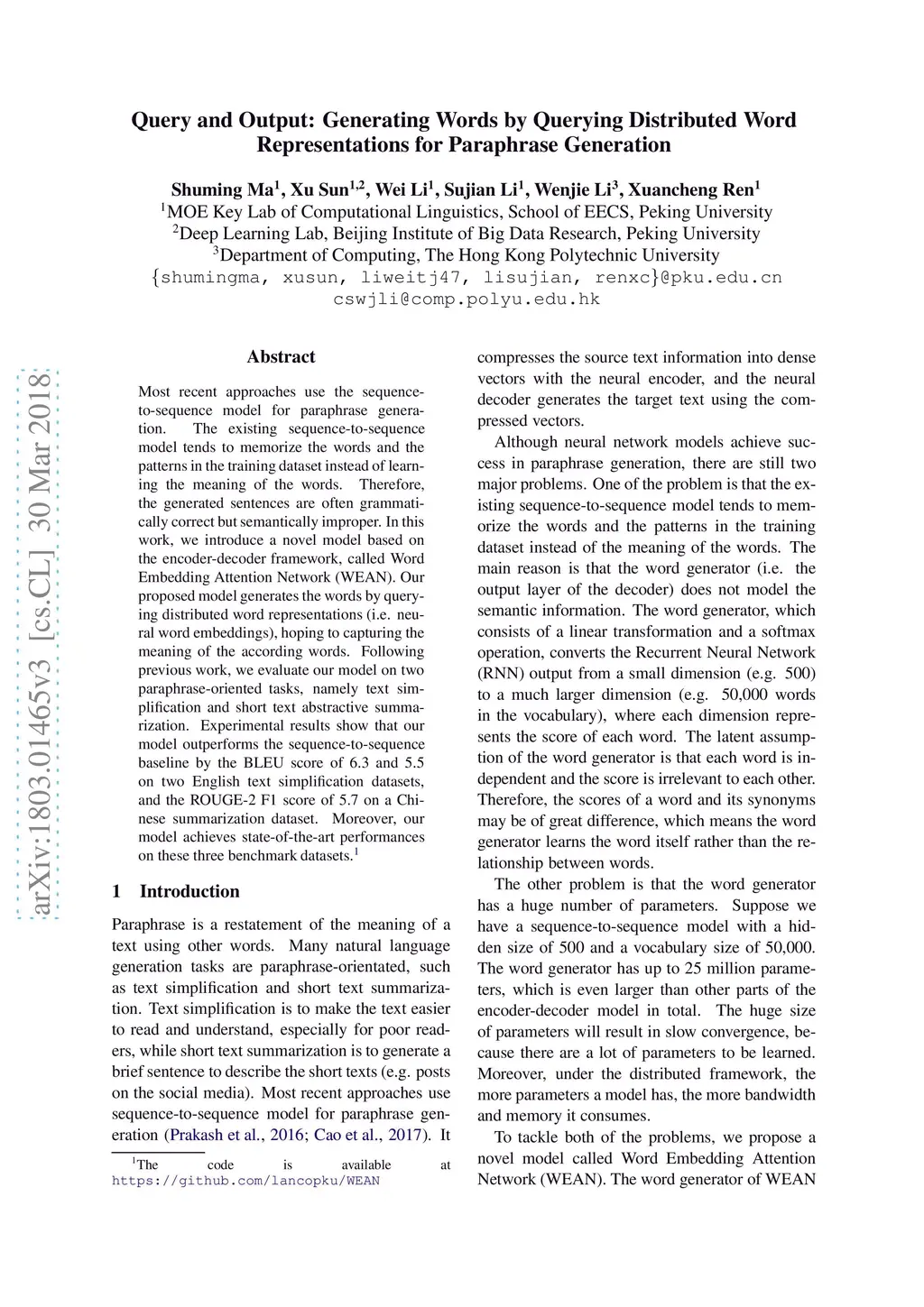 Most recent approaches use the sequence-to-sequence model for paraphrase generation. The existing sequence-to-sequence model tends to memorize the words and the patterns in the training dataset instead of learning the meaning of the words. Therefore, the generated sentences are often grammatically correct but semantically improper. In this work, we introduce a novel model based on the encoder-decoder framework, called Word Embedding Attention Network (WEAN). Our proposed model generates the words by querying distributed word representations (i.e. neural word embeddings), hoping to capturing the meaning of the according words. Following previous work, we evaluate our model on two paraphrase-oriented tasks, namely text simplification and short text abstractive summarization. Experimental results show that our model outperforms the sequence-to-sequence baseline by the BLEU score of 6.3 and 5.5 on two English text simplification datasets, and the ROUGE-2 F1 score of 5.7 on a Chinese summarization dataset. Moreover, our model achieves state-of-the-art performances on these three benchmark datasets.