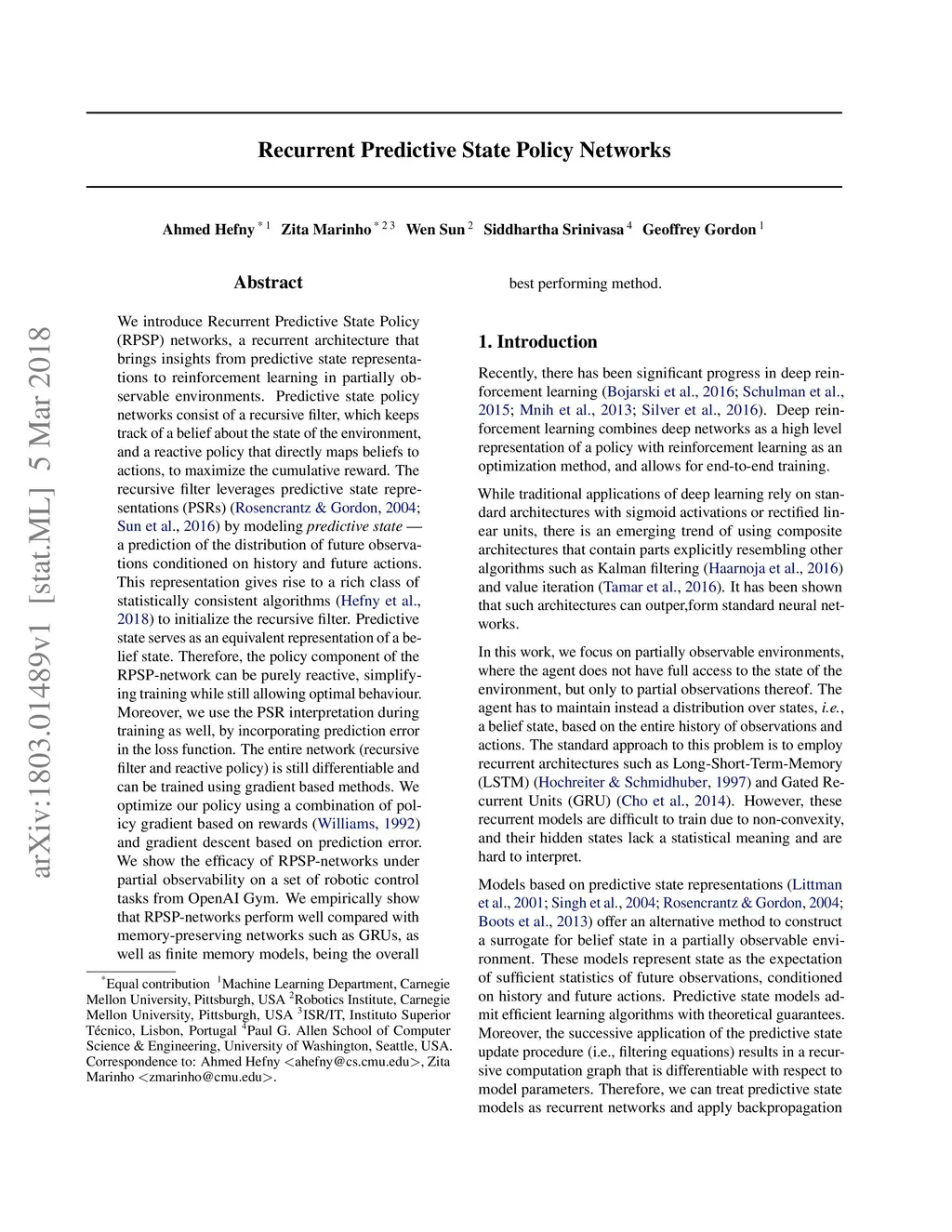 Recurrent Predictive State Policy Networks