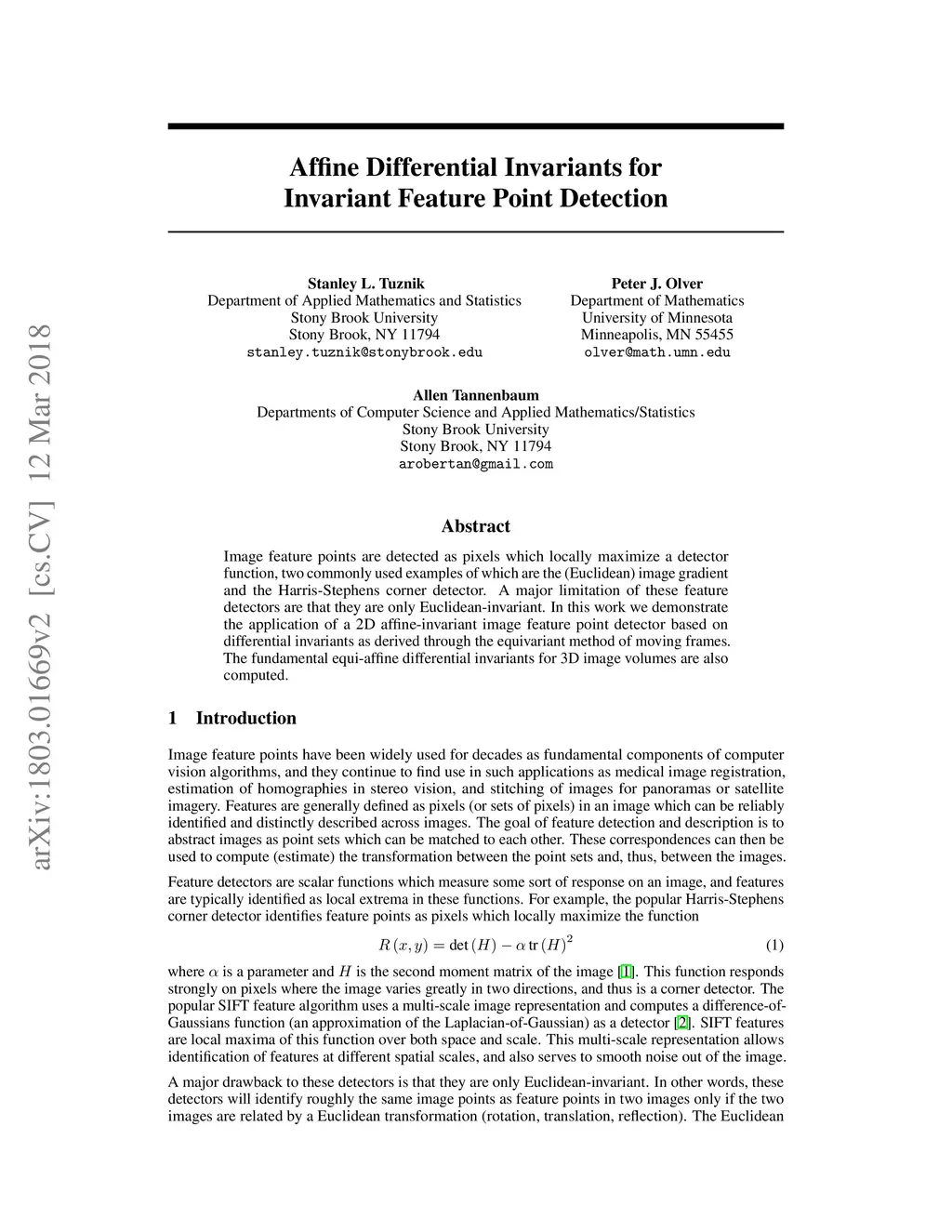 Image feature points are detected as pixels which locally maximize a detector function, two commonly used examples of which are the (Euclidean) image gradient and the Harris-Stephens corner detector. A major limitation of these feature detectors are that they are only Euclidean-invariant. In this work we demonstrate the application of a 2D affine-invariant image feature point detector based on differential invariants as derived through the equivariant method of moving frames. The fundamental equi-affine differential invariants for 3D image volumes are also computed.