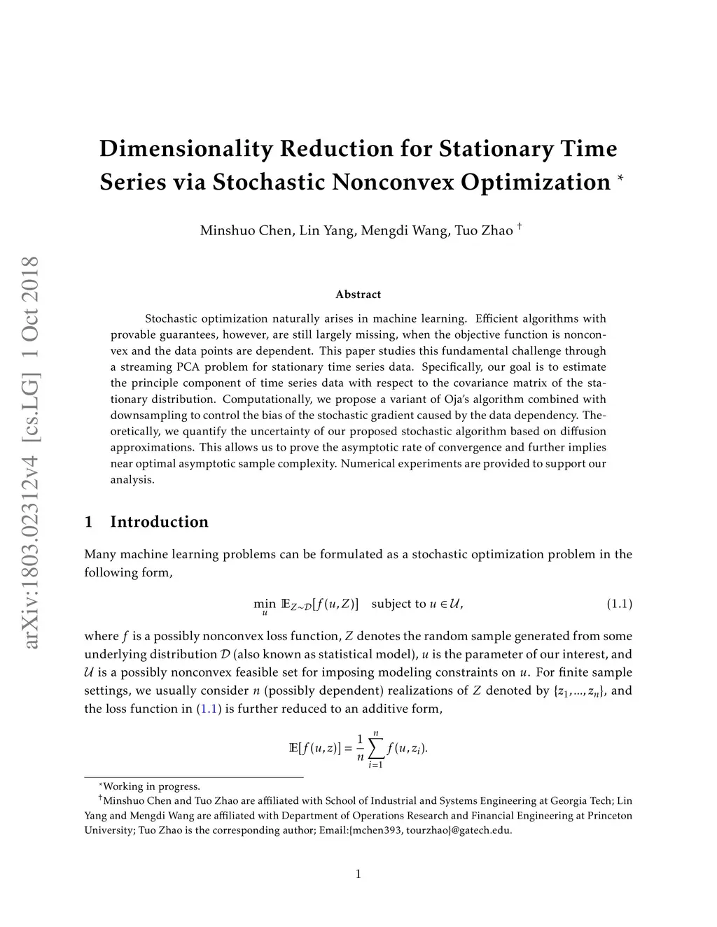 Stochastic optimization naturally arises in machine learning. Efficient algorithms with provable guarantees, however, are still largely missing, when the objective function is nonconvex and the data points are dependent. This paper studies this fundamental challenge through a streaming PCA problem for stationary time series data. Specifically, our goal is to estimate the principle component of time series data with respect to the covariance matrix of the stationary distribution. Computationally, we propose a variant of Oja's algorithm combined with downsampling to control the bias of the stochastic gradient caused by the data dependency. Theoretically, we quantify the uncertainty of our proposed stochastic algorithm based on diffusion approximations. This allows us to prove the asymptotic rate of convergence and further implies near optimal asymptotic sample complexity. Numerical experiments are provided to support our analysis.