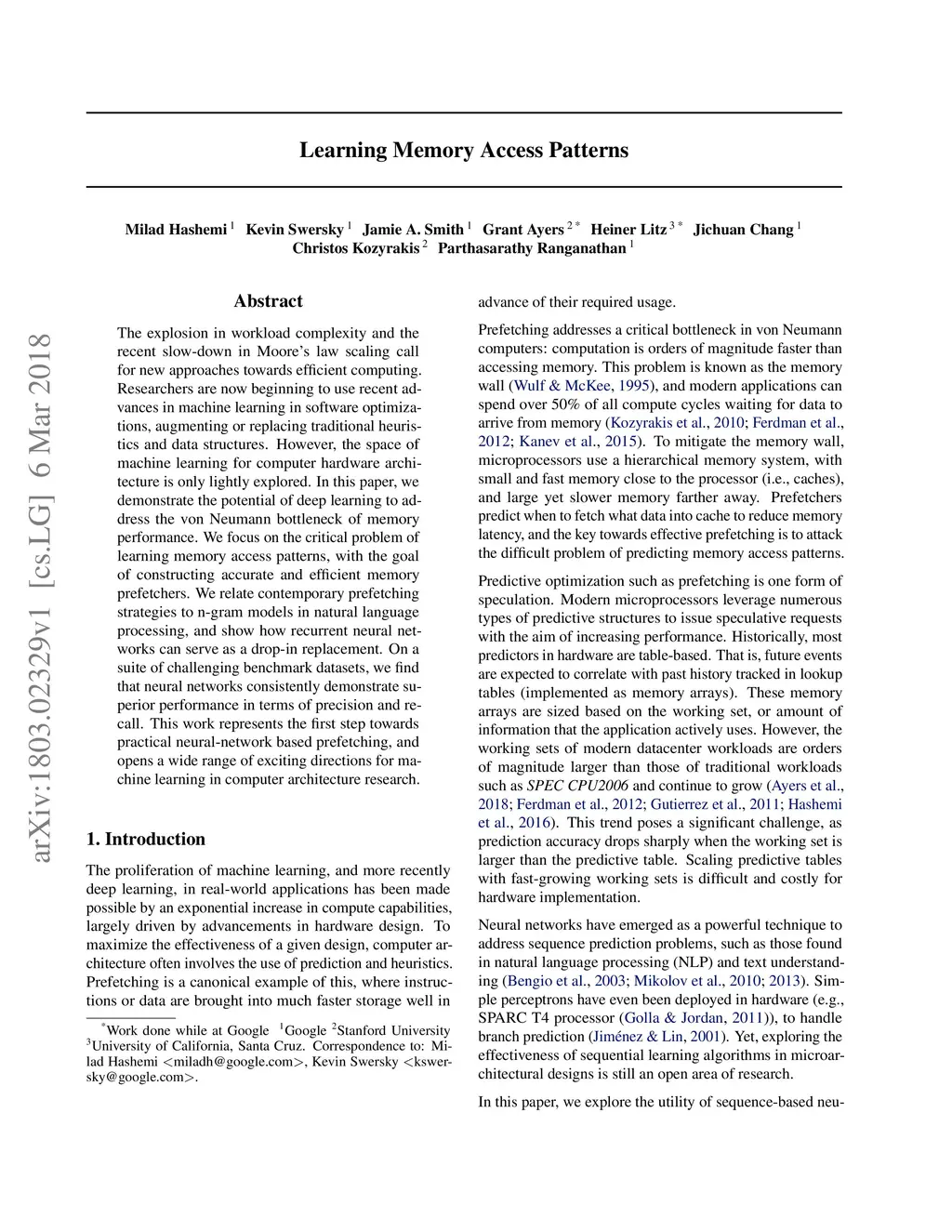 The explosion in workload complexity and the recent slow-down in Moore's law scaling call for new approaches towards efficient computing. Researchers are now beginning to use recent advances in machine learning in software optimizations, augmenting or replacing traditional heuristics and data structures. However, the space of machine learning for computer hardware architecture is only lightly explored. In this paper, we demonstrate the potential of deep learning to address the von Neumann bottleneck of memory performance. We focus on the critical problem of learning memory access patterns, with the goal of constructing accurate and efficient memory prefetchers. We relate contemporary prefetching strategies to n-gram models in natural language processing, and show how recurrent neural networks can serve as a drop-in replacement. On a suite of challenging benchmark datasets, we find that neural networks consistently demonstrate superior performance in terms of precision and recall. This work represents the first step towards practical neural-network based prefetching, and opens a wide range of exciting directions for machine learning in computer architecture research.
