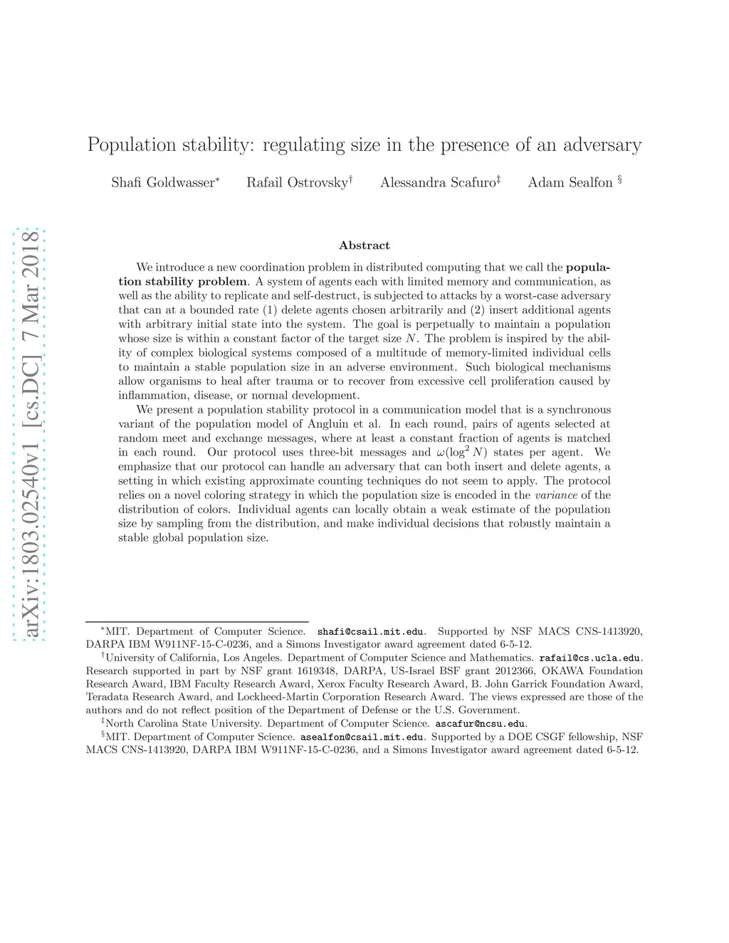 We introduce a new coordination problem in distributed computing that we call the population stability problem. A system of agents each with limited memory and communication, as well as the ability to replicate and self-destruct, is subjected to attacks by a worst-case adversary that can at a bounded rate (1) delete agents chosen arbitrarily and (2) insert additional agents with arbitrary initial state into the system. The goal is perpetually to maintain a population whose size is within a constant factor of the target size . The problem is inspired by the ability of complex biological systems composed of a multitude of memory-limited individual cells to maintain a stable population size in an adverse environment. Such biological mechanisms allow organisms to heal after trauma or to recover from excessive cell proliferation caused by inflammation, disease, or normal development. We present a population stability protocol in a communication model that is a synchronous variant of the population model of Angluin et al. In each round, pairs of agents selected at random meet and exchange messages, where at least a constant fraction of agents is matched in each round. Our protocol uses three-bit messages and states per agent. We emphasize that our protocol can handle an adversary that can both insert and delete agents, a setting in which existing approximate counting techniques do not seem to apply. The protocol relies on a novel coloring strategy in which the population size is encoded in the variance of the distribution of colors. Individual agents can locally obtain a weak estimate of the population size by sampling from the distribution, and make individual decisions that robustly maintain a stable global population size.