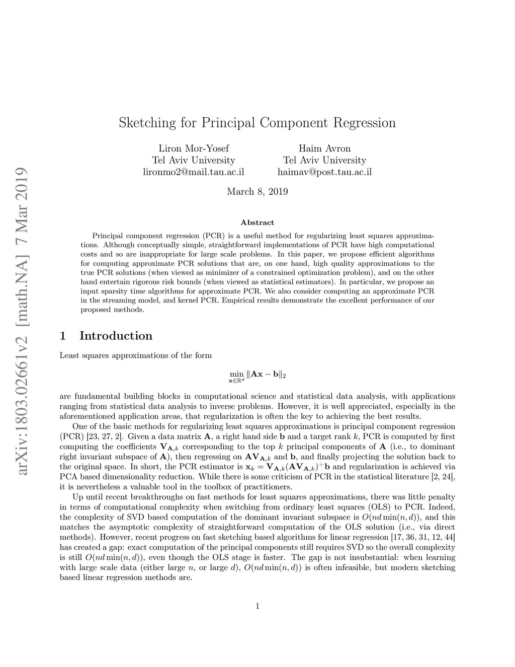 Principal component regression (PCR) is a useful method for regularizing linear regression. Although conceptually simple, straightforward implementations of PCR have high computational costs and so are inappropriate when learning with large scale data. In this paper, we propose efficient algorithms for computing approximate PCR solutions that are, on one hand, high quality approximations to the true PCR solutions (when viewed as minimizer of a constrained optimization problem), and on the other hand entertain rigorous risk bounds (when viewed as statistical estimators). In particular, we propose an input sparsity time algorithms for approximate PCR. We also consider computing an approximate PCR in the streaming model, and kernel PCR. Empirical results demonstrate the excellent performance of our proposed methods.