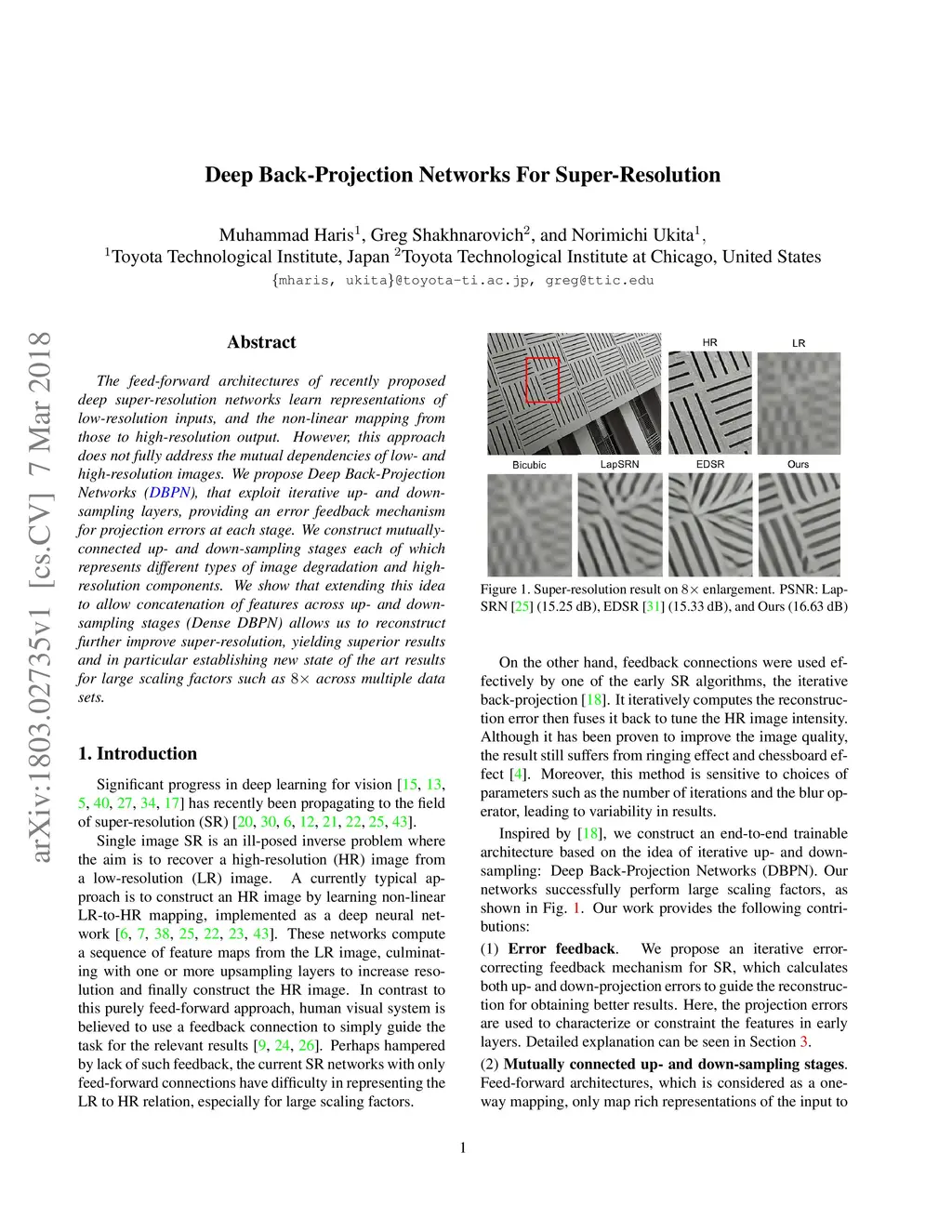The feed-forward architectures of recently proposed deep super-resolution networks learn representations of low-resolution inputs, and the non-linear mapping from those to high-resolution output. However, this approach does not fully address the mutual dependencies of low- and high-resolution images. We propose Deep Back-Projection Networks (DBPN), that exploit iterative up- and down-sampling layers, providing an error feedback mechanism for projection errors at each stage. We construct mutually-connected up- and down-sampling stages each of which represents different types of image degradation and high-resolution components. We show that extending this idea to allow concatenation of features across up- and down-sampling stages (Dense DBPN) allows us to reconstruct further improve super-resolution, yielding superior results and in particular establishing new state of the art results for large scaling factors such as 8x across multiple data sets.