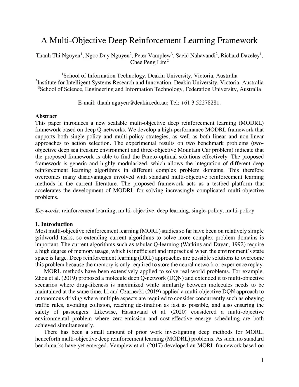 This paper introduces a new scalable multi-objective deep reinforcement learning (MODRL) framework based on deep Q-networks. We develop a high-performance MODRL framework that supports both single-policy and multi-policy strategies, as well as both linear and non-linear approaches to action selection. The experimental results on two benchmark problems (two-objective deep sea treasure environment and three-objective Mountain Car problem) indicate that the proposed framework is able to find the Pareto-optimal solutions effectively. The proposed framework is generic and highly modularized, which allows the integration of different deep reinforcement learning algorithms in different complex problem domains. This therefore overcomes many disadvantages involved with standard multi-objective reinforcement learning methods in the current literature. The proposed framework acts as a testbed platform that accelerates the development of MODRL for solving increasingly complicated multi-objective problems.