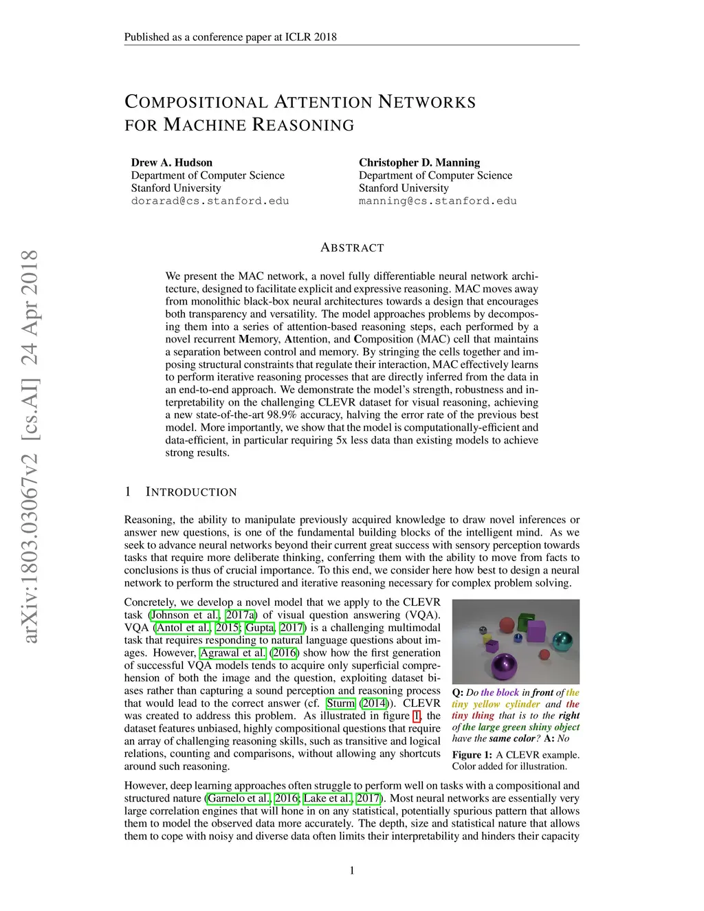 We present the MAC network, a novel fully differentiable neural network architecture, designed to facilitate explicit and expressive reasoning. MAC moves away from monolithic black-box neural architectures towards a design that encourages both transparency and versatility. The model approaches problems by decomposing them into a series of attention-based reasoning steps, each performed by a novel recurrent Memory, Attention, and Composition (MAC) cell that maintains a separation between control and memory. By stringing the cells together and imposing structural constraints that regulate their interaction, MAC effectively learns to perform iterative reasoning processes that are directly inferred from the data in an end-to-end approach. We demonstrate the model's strength, robustness and interpretability on the challenging CLEVR dataset for visual reasoning, achieving a new state-of-the-art 98.9% accuracy, halving the error rate of the previous best model. More importantly, we show that the model is computationally-efficient and data-efficient, in particular requiring 5x less data than existing models to achieve strong results.