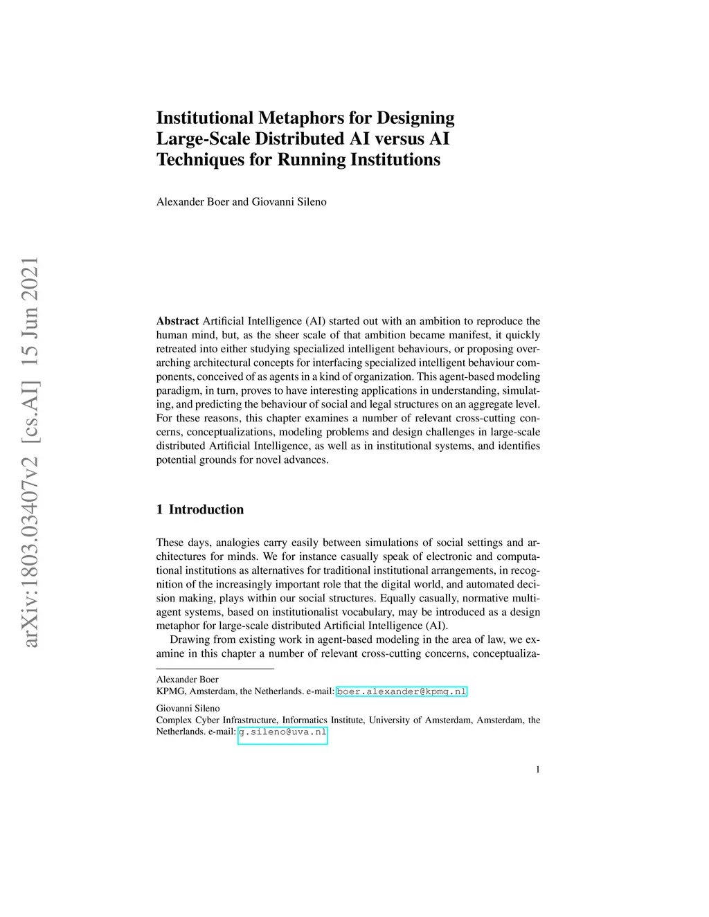 Artificial Intelligence (AI) started out with an ambition to reproduce the human mind, but, as the sheer scale of that ambition became manifest, it quickly retreated into either studying specialized intelligent behaviours, or proposing over-arching architectural concepts for interfacing specialized intelligent behaviour components, conceived of as agents in a kind of organization. This agent-based modeling paradigm, in turn, proves to have interesting applications in understanding, simulating, and predicting the behaviour of social and legal structures on an aggregate level. For these reasons, this chapter examines a number of relevant cross-cutting concerns, conceptualizations, modeling problems and design challenges in large-scale distributed Artificial Intelligence, as well as in institutional systems, and identifies potential grounds for novel advances.