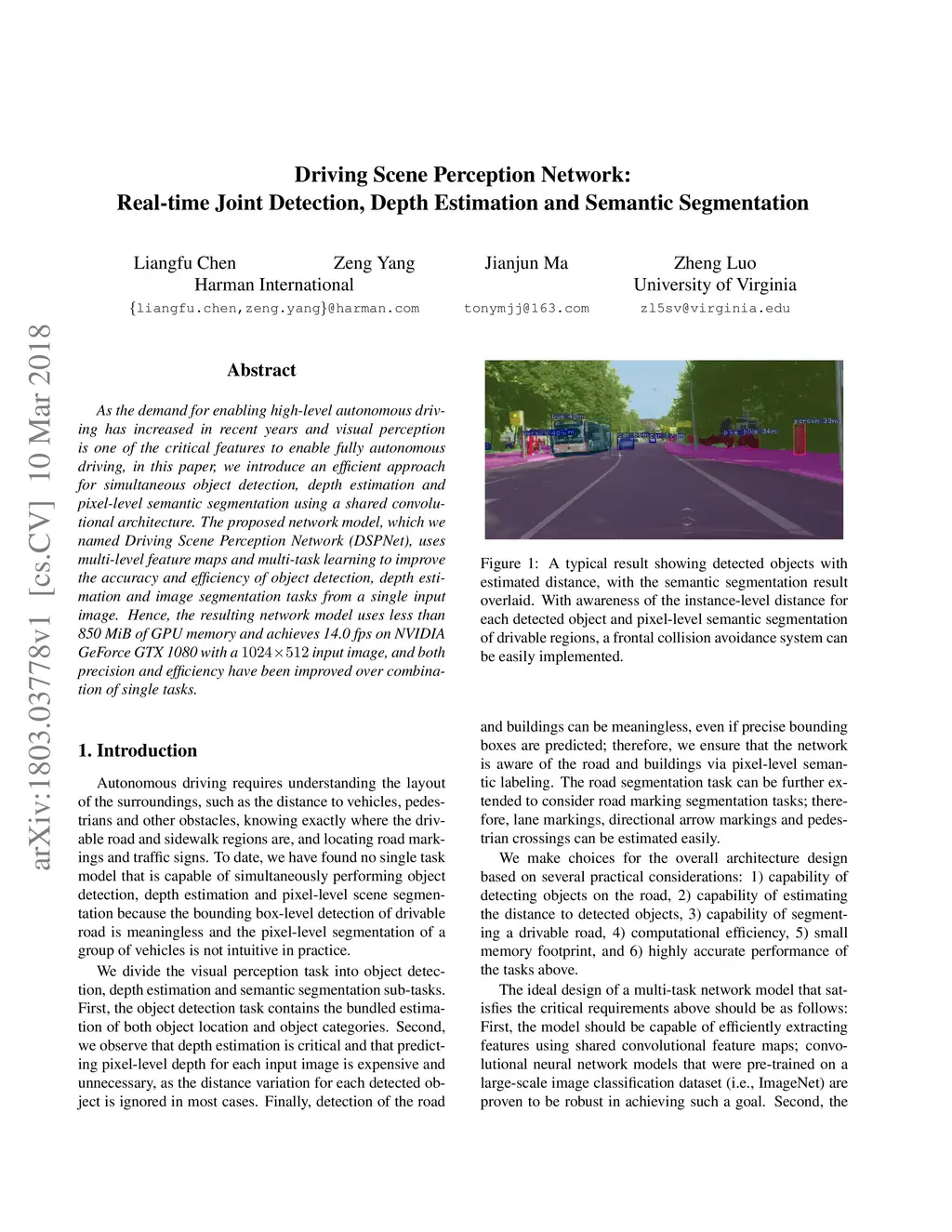 As the demand for enabling high-level autonomous driving has increased in recent years and visual perception is one of the critical features to enable fully autonomous driving, in this paper, we introduce an efficient approach for simultaneous object detection, depth estimation and pixel-level semantic segmentation using a shared convolutional architecture. The proposed network model, which we named Driving Scene Perception Network (DSPNet), uses multi-level feature maps and multi-task learning to improve the accuracy and efficiency of object detection, depth estimation and image segmentation tasks from a single input image. Hence, the resulting network model uses less than 850 MiB of GPU memory and achieves 14.0 fps on NVIDIA GeForce GTX 1080 with a 1024x512 input image, and both precision and efficiency have been improved over combination of single tasks.