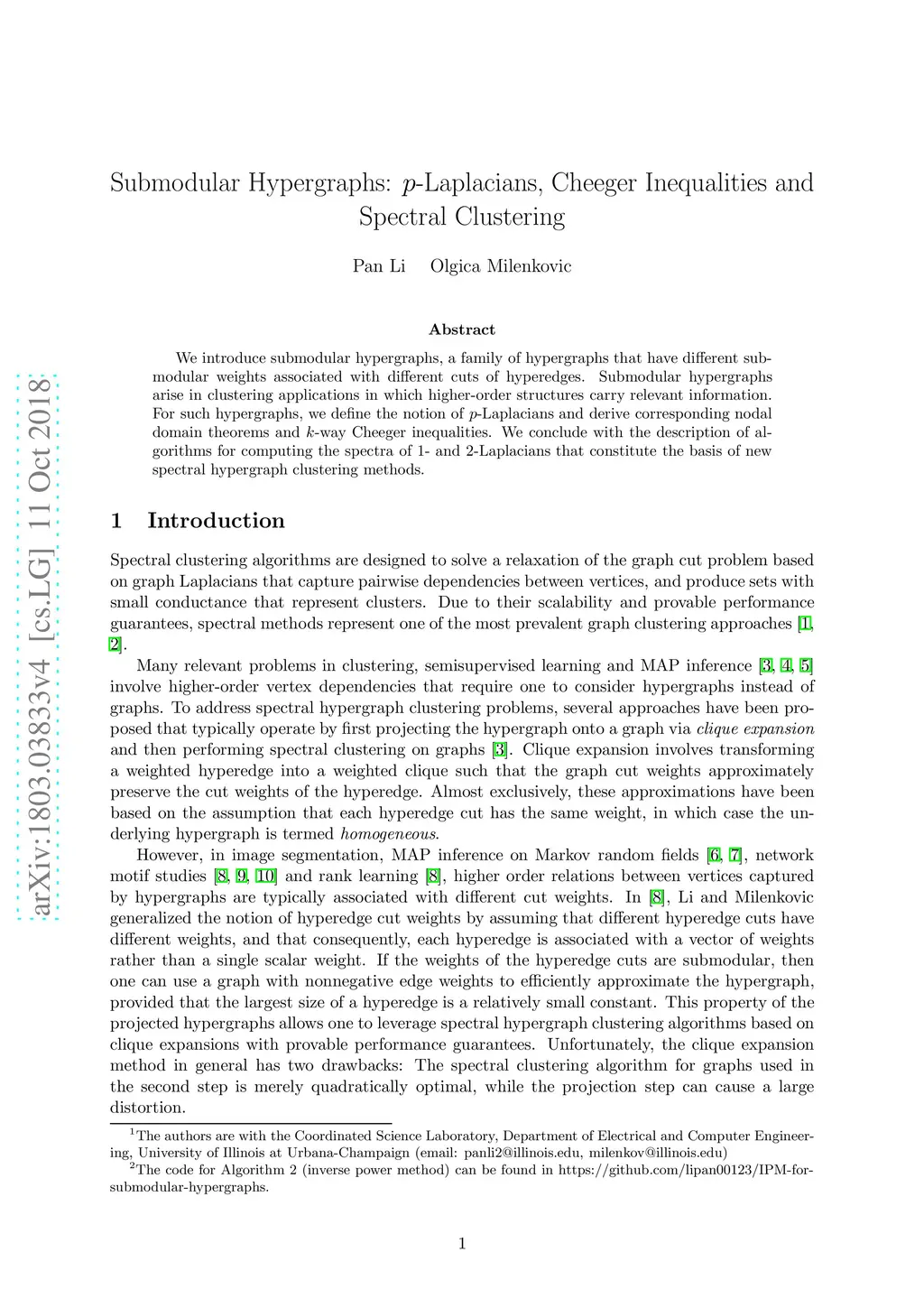 We introduce submodular hypergraphs, a family of hypergraphs that have different submodular weights associated with different cuts of hyperedges. Submodular hypergraphs arise in clustering applications in which higher-order structures carry relevant information. For such hypergraphs, we define the notion of p-Laplacians and derive corresponding nodal domain theorems and k-way Cheeger inequalities. We conclude with the description of algorithms for computing the spectra of 1- and 2-Laplacians that constitute the basis of new spectral hypergraph clustering methods.