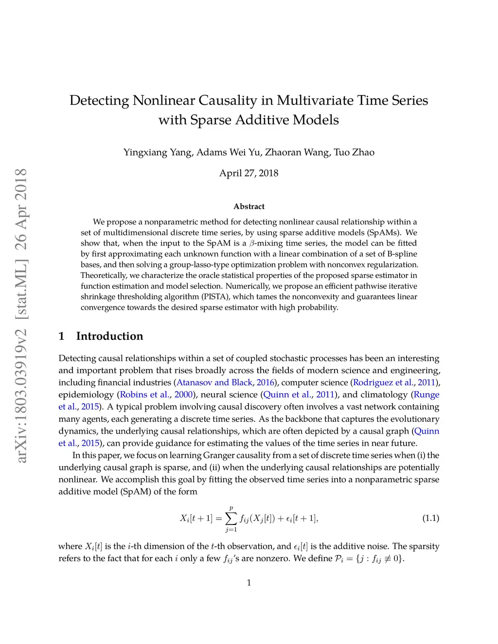We propose a nonparametric method for detecting nonlinear causal relationship within a set of multidimensional discrete time series, by using sparse additive models (SpAMs). We show that, when the input to the SpAM is a -mixing time series, the model can be fitted by first approximating each unknown function with a linear combination of a set of B-spline bases, and then solving a group-lasso-type optimization problem with nonconvex regularization. Theoretically, we characterize the oracle statistical properties of the proposed sparse estimator in function estimation and model selection. Numerically, we propose an efficient pathwise iterative shrinkage thresholding algorithm (PISTA), which tames the nonconvexity and guarantees linear convergence towards the desired sparse estimator with high probability.