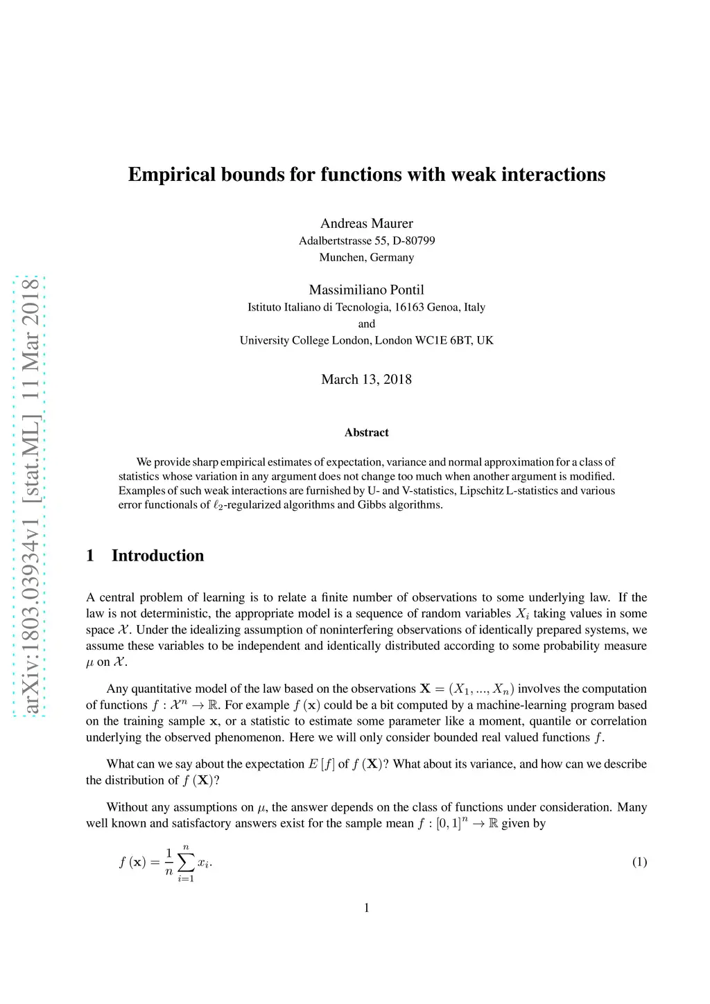 We provide sharp empirical estimates of expectation, variance and normal approximation for a class of statistics whose variation in any argument does not change too much when another argument is modified. Examples of such weak interactions are furnished by U- and V-statistics, Lipschitz L-statistics and various error functionals of L2-regularized algorithms and Gibbs algorithms.