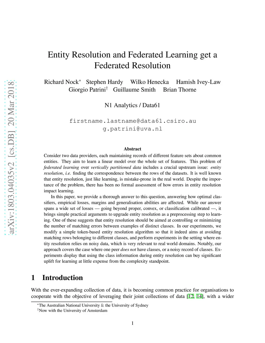 Consider two data providers, each maintaining records of different feature sets about common entities. They aim to learn a linear model over the whole set of features. This problem of federated learning over vertically partitioned data includes a crucial upstream issue: entity resolution, i.e. finding the correspondence between the rows of the datasets. It is well known that entity resolution, just like learning, is mistake-prone in the real world. Despite the importance of the problem, there has been no formal assessment of how errors in entity resolution impact learning. In this paper, we provide a thorough answer to this question, answering how optimal classifiers, empirical losses, margins and generalisation abilities are affected. While our answer spans a wide set of losses --- going beyond proper, convex, or classification calibrated ---, it brings simple practical arguments to upgrade entity resolution as a preprocessing step to learning. One of these suggests that entity resolution should be aimed at controlling or minimizing the number of matching errors between examples of distinct classes. In our experiments, we modify a simple token-based entity resolution algorithm so that it indeed aims at avoiding matching rows belonging to different classes, and perform experiments in the setting where entity resolution relies on noisy data, which is very relevant to real world domains. Notably, our approach covers the case where one peer \textit{does not} have classes, or a noisy record of classes. Experiments display that using the class information during entity resolution can buy significant uplift for learning at little expense from the complexity standpoint.