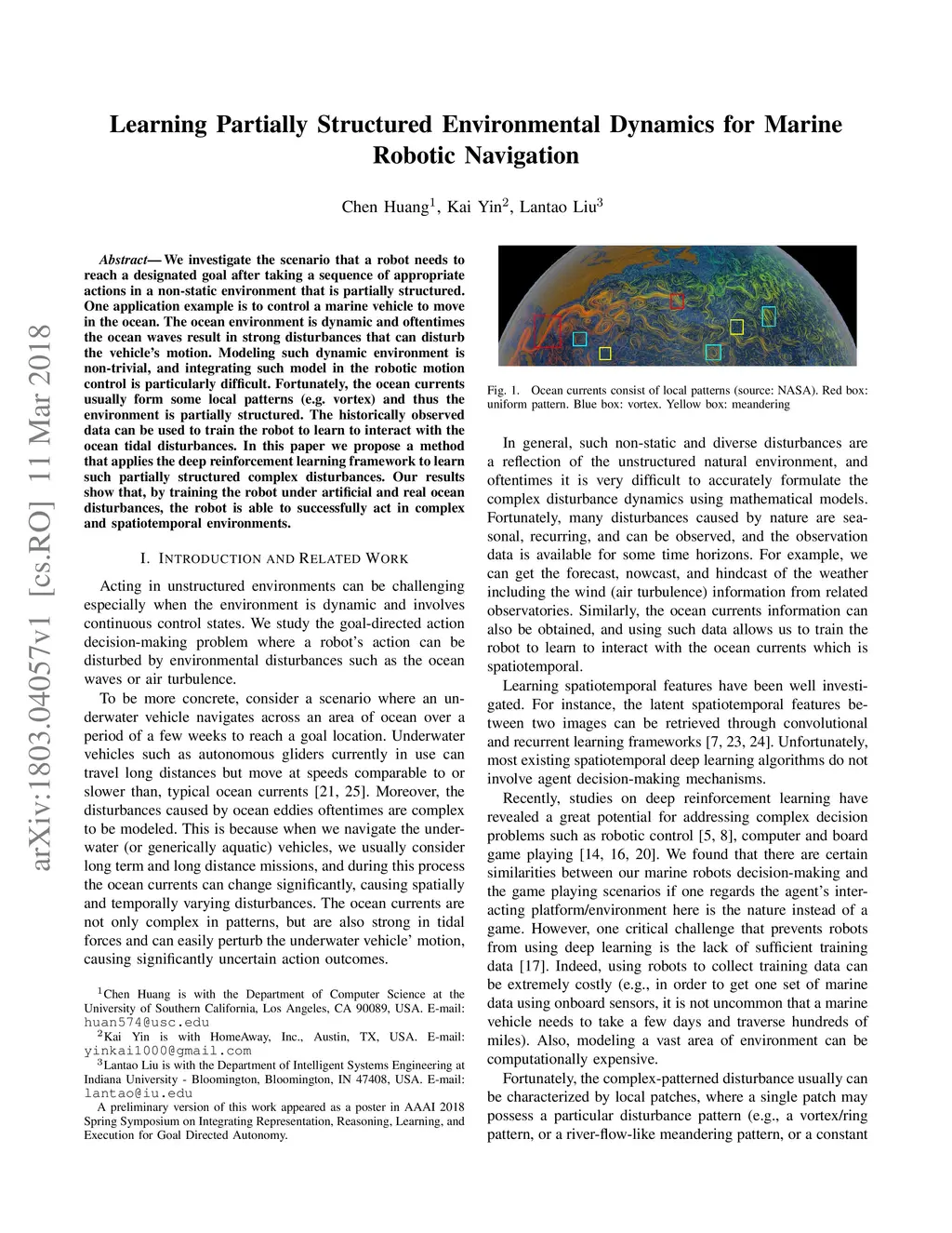 We investigate the scenario that a robot needs to reach a designated goal after taking a sequence of appropriate actions in a non-static environment that is partially structured. One application example is to control a marine vehicle to move in the ocean. The ocean environment is dynamic and oftentimes the ocean waves result in strong disturbances that can disturb the vehicle's motion. Modeling such dynamic environment is non-trivial, and integrating such model in the robotic motion control is particularly difficult. Fortunately, the ocean currents usually form some local patterns (e.g. vortex) and thus the environment is partially structured. The historically observed data can be used to train the robot to learn to interact with the ocean tidal disturbances. In this paper we propose a method that applies the deep reinforcement learning framework to learn such partially structured complex disturbances. Our results show that, by training the robot under artificial and real ocean disturbances, the robot is able to successfully act in complex and spatiotemporal environments.