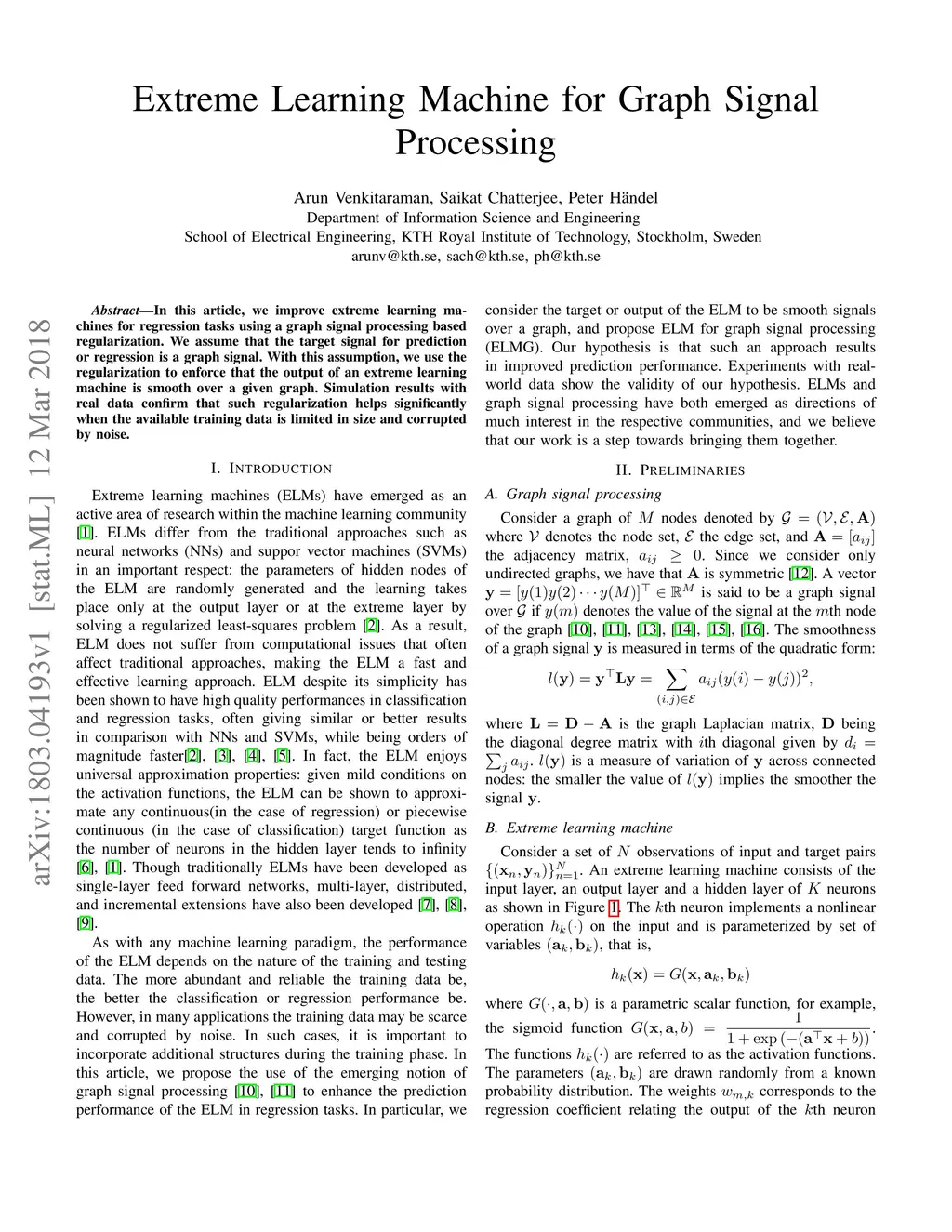 In this article, we improve extreme learning machines for regression tasks using a graph signal processing based regularization. We assume that the target signal for prediction or regression is a graph signal. With this assumption, we use the regularization to enforce that the output of an extreme learning machine is smooth over a given graph. Simulation results with real data confirm that such regularization helps significantly when the available training data is limited in size and corrupted by noise.