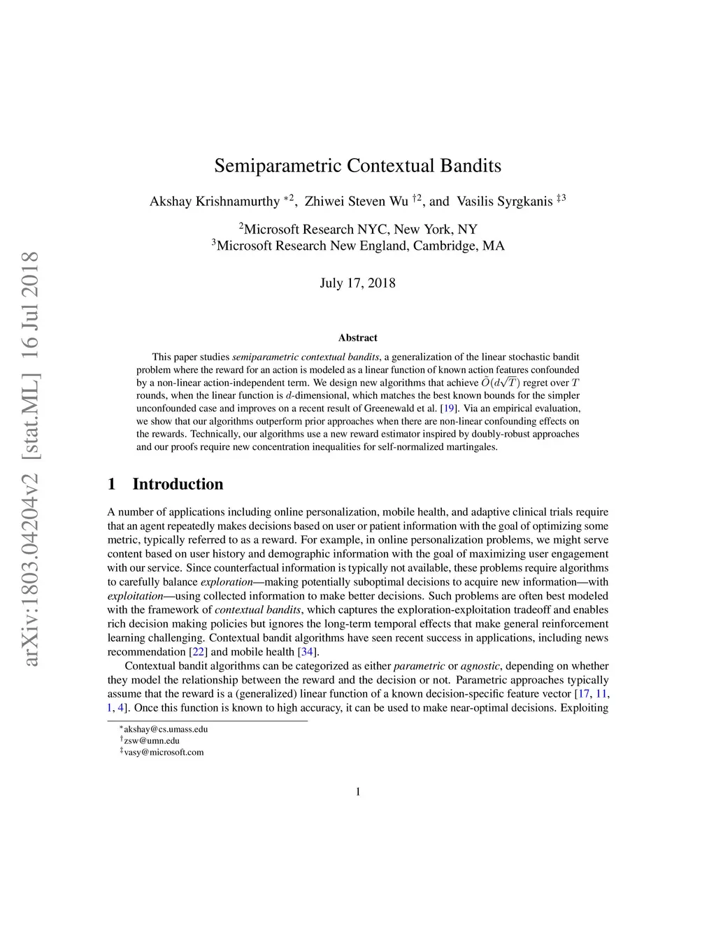 Semiparametric Contextual Bandits