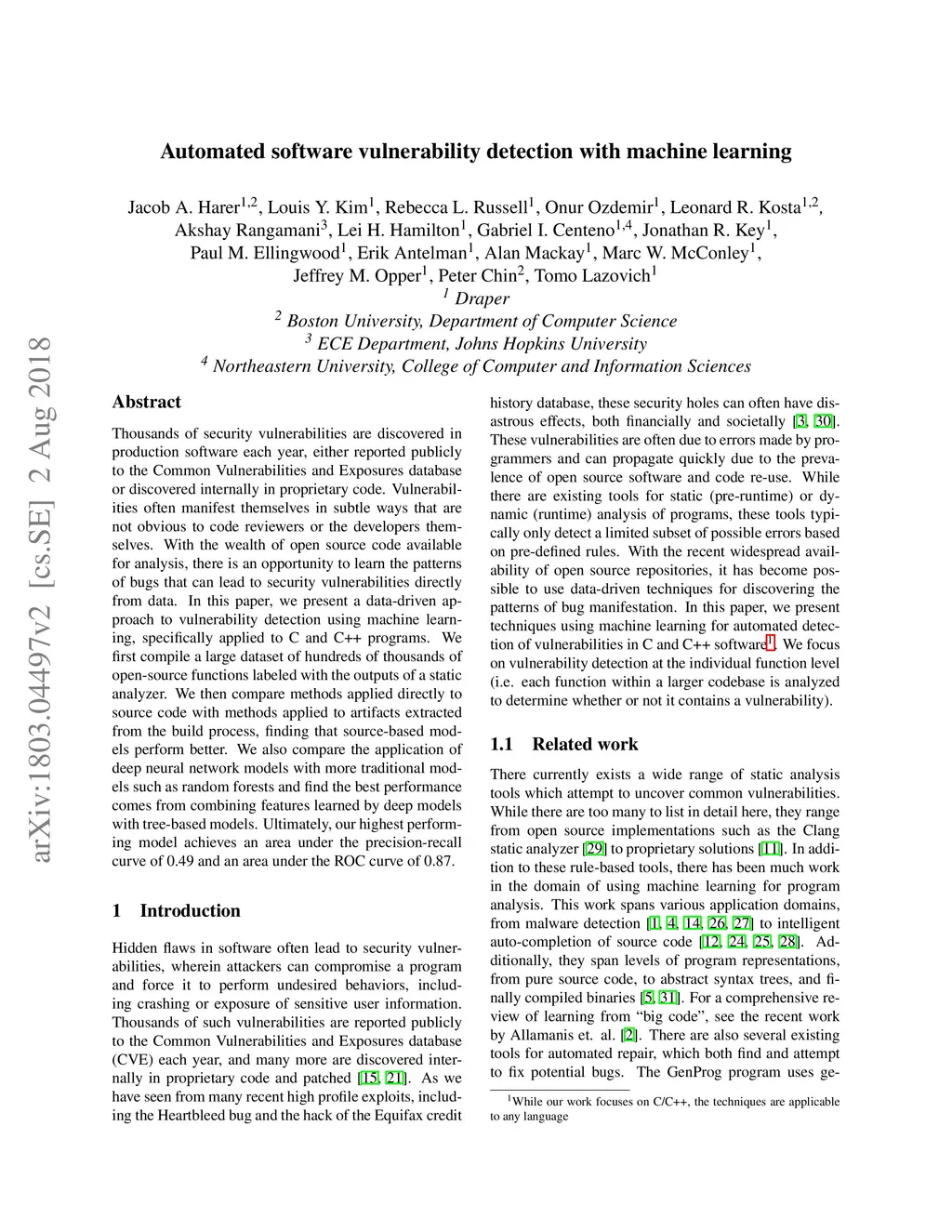 Thousands of security vulnerabilities are discovered in production software each year, either reported publicly to the Common Vulnerabilities and Exposures database or discovered internally in proprietary code. Vulnerabilities often manifest themselves in subtle ways that are not obvious to code reviewers or the developers themselves. With the wealth of open source code available for analysis, there is an opportunity to learn the patterns of bugs that can lead to security vulnerabilities directly from data. In this paper, we present a data-driven approach to vulnerability detection using machine learning, specifically applied to C and C++ programs. We first compile a large dataset of hundreds of thousands of open-source functions labeled with the outputs of a static analyzer. We then compare methods applied directly to source code with methods applied to artifacts extracted from the build process, finding that source-based models perform better. We also compare the application of deep neural network models with more traditional models such as random forests and find the best performance comes from combining features learned by deep models with tree-based models. Ultimately, our highest performing model achieves an area under the precision-recall curve of 0.49 and an area under the ROC curve of 0.87.