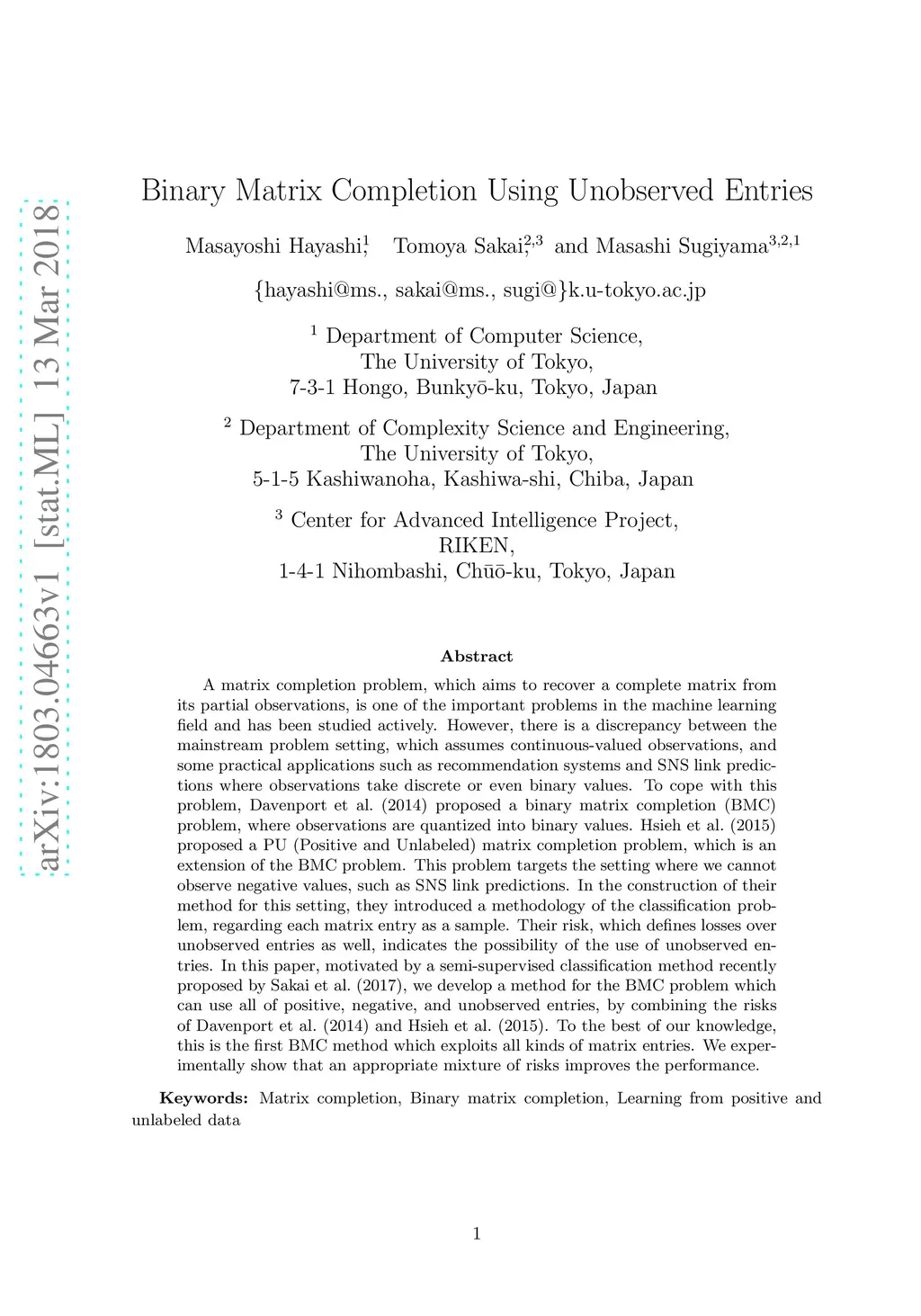 A matrix completion problem, which aims to recover a complete matrix from its partial observations, is one of the important problems in the machine learning field and has been studied actively. However, there is a discrepancy between the mainstream problem setting, which assumes continuous-valued observations, and some practical applications such as recommendation systems and SNS link predictions where observations take discrete or even binary values. To cope with this problem, Davenport et al. (2014) proposed a binary matrix completion (BMC) problem, where observations are quantized into binary values. Hsieh et al. (2015) proposed a PU (Positive and Unlabeled) matrix completion problem, which is an extension of the BMC problem. This problem targets the setting where we cannot observe negative values, such as SNS link predictions. In the construction of their method for this setting, they introduced a methodology of the classification problem, regarding each matrix entry as a sample. Their risk, which defines losses over unobserved entries as well, indicates the possibility of the use of unobserved entries. In this paper, motivated by a semi-supervised classification method recently proposed by Sakai et al. (2017), we develop a method for the BMC problem which can use all of positive, negative, and unobserved entries, by combining the risks of Davenport et al. (2014) and Hsieh et al. (2015). To the best of our knowledge, this is the first BMC method which exploits all kinds of matrix entries. We experimentally show that an appropriate mixture of risks improves the performance.