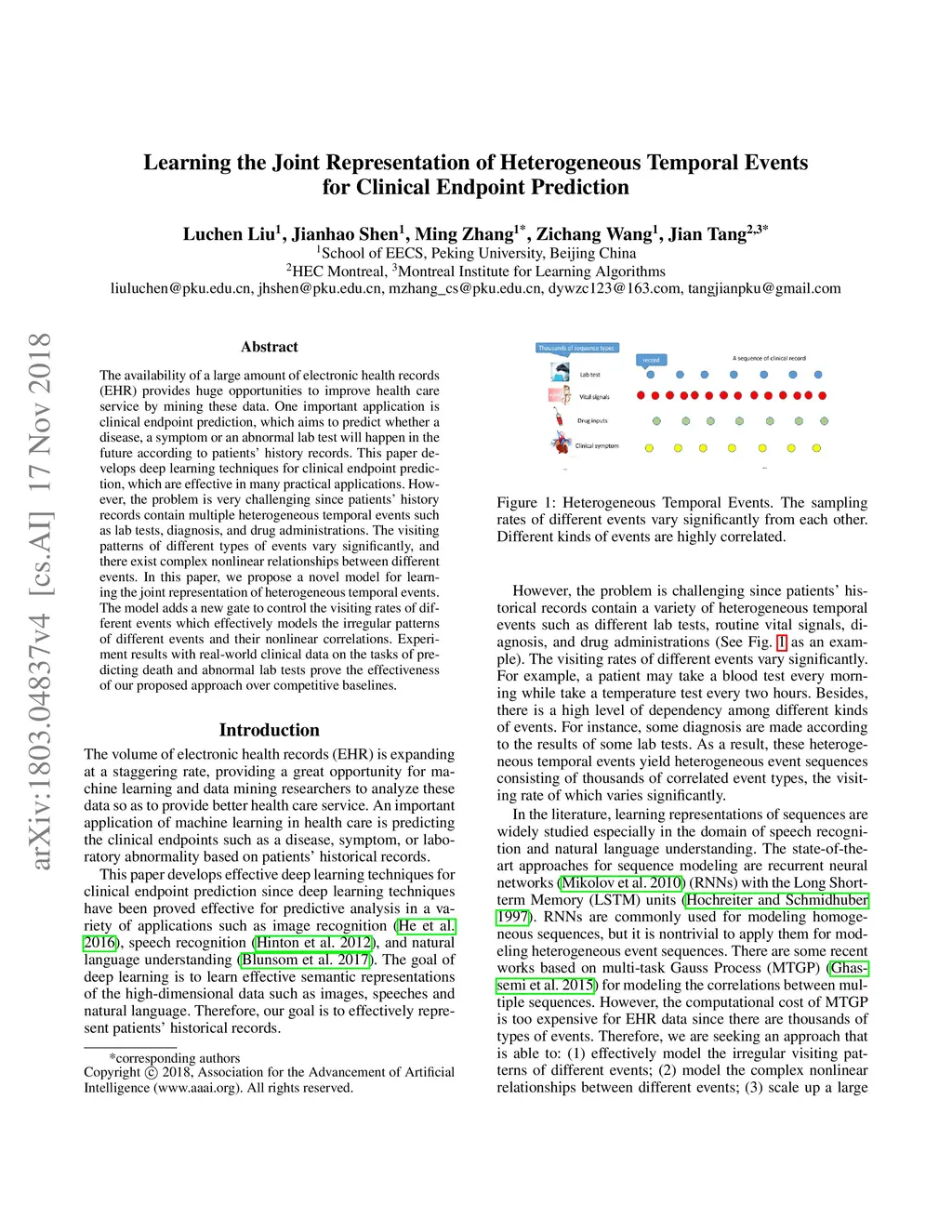The availability of a large amount of electronic health records (EHR) provides huge opportunities to improve health care service by mining these data. One important application is clinical endpoint prediction, which aims to predict whether a disease, a symptom or an abnormal lab test will happen in the future according to patients' history records. This paper develops deep learning techniques for clinical endpoint prediction, which are effective in many practical applications. However, the problem is very challenging since patients' history records contain multiple heterogeneous temporal events such as lab tests, diagnosis, and drug administrations. The visiting patterns of different types of events vary significantly, and there exist complex nonlinear relationships between different events. In this paper, we propose a novel model for learning the joint representation of heterogeneous temporal events. The model adds a new gate to control the visiting rates of different events which effectively models the irregular patterns of different events and their nonlinear correlations. Experiment results with real-world clinical data on the tasks of predicting death and abnormal lab tests prove the effectiveness of our proposed approach over competitive baselines.