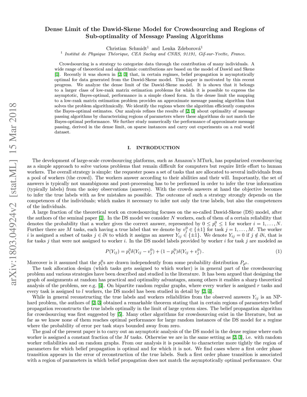Crowdsourcing is a strategy to categorize data through the contribution of many individuals. A wide range of theoretical and algorithmic contributions are based on the model of Dawid and Skene \cite{DawidSkene79}. Recently it was shown in \cite{ok16,ok2016optimal} that, in certain regimes, belief propagation is asymptotically optimal for data generated from the Dawid-Skene model. This paper is motivated by this recent progress. We analyze the dense limit of the Dawid-Skene model. It is shown that it belongs to a larger class of low-rank matrix estimation problems for which it is possible to express the asymptotic, Bayes-optimal, performance in a simple closed form. In the dense limit the mapping to a low-rank matrix estimation problem provides an approximate message passing algorithm that solves the problem algorithmically. We identify the regions where the algorithm efficiently computes the Bayes-optimal estimates. Our analysis refines the results of \cite{ok16,ok2016optimal} about optimality of message passing algorithms by characterizing regions of parameters where these algorithms do not match the Bayes-optimal performance. We further study numerically the performance of approximate message passing, derived in the dense limit, on sparse instances and carry out experiments on a real world dataset.