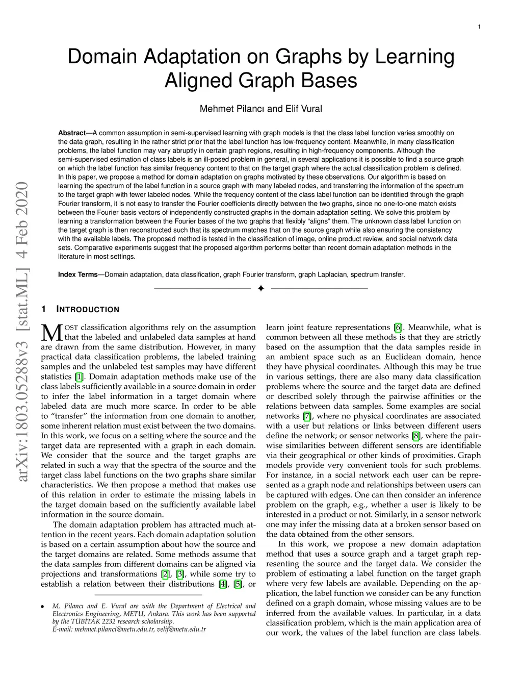 A common assumption in semi-supervised learning with graph models is that the class label function varies smoothly on the data graph, resulting in the rather strict prior that the label function has low-frequency content. Meanwhile, in many classification problems, the label function may vary abruptly in certain graph regions, resulting in high-frequency components. Although the semi-supervised estimation of class labels is an ill-posed problem in general, in several applications it is possible to find a source graph on which the label function has similar frequency content to that on the target graph where the actual classification problem is defined. In this paper, we propose a method for domain adaptation on graphs motivated by these observations. Our algorithm is based on learning the spectrum of the label function in a source graph with many labeled nodes, and transferring the information of the spectrum to the target graph with fewer labeled nodes. While the frequency content of the class label function can be identified through the graph Fourier transform, it is not easy to transfer the Fourier coefficients directly between the two graphs, since no one-to-one match exists between the Fourier basis vectors of independently constructed graphs in the domain adaptation setting. We solve this problem by learning a transformation between the Fourier bases of the two graphs that flexibly ``aligns'' them. The unknown class label function on the target graph is then reconstructed such that its spectrum matches that on the source graph while also ensuring the consistency with the available labels. The proposed method is tested in the classification of image, online product review, and social network data sets. Comparative experiments suggest that the proposed algorithm performs better than recent domain adaptation methods in the literature in most settings.