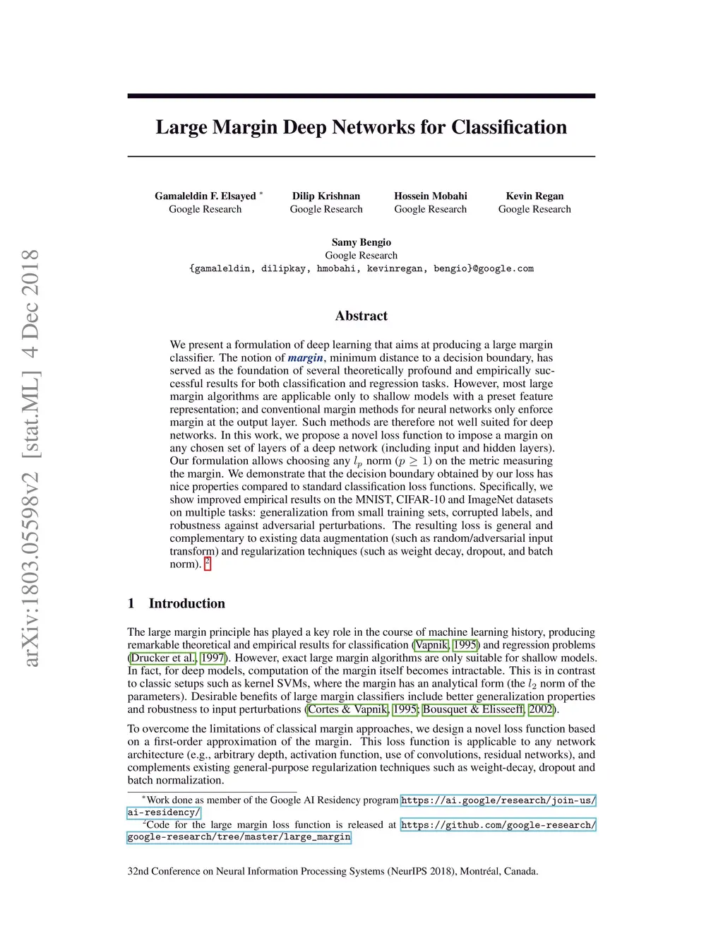 We present a formulation of deep learning that aims at producing a large margin classifier. The notion of margin, minimum distance to a decision boundary, has served as the foundation of several theoretically profound and empirically successful results for both classification and regression tasks. However, most large margin algorithms are applicable only to shallow models with a preset feature representation; and conventional margin methods for neural networks only enforce margin at the output layer. Such methods are therefore not well suited for deep networks. In this work, we propose a novel loss function to impose a margin on any chosen set of layers of a deep network (including input and hidden layers). Our formulation allows choosing any norm on the metric measuring the margin. We demonstrate that the decision boundary obtained by our loss has nice properties compared to standard classification loss functions. Specifically, we show improved empirical results on the MNIST, CIFAR-10 and ImageNet datasets on multiple tasks: generalization from small training sets, corrupted labels, and robustness against adversarial perturbations. The resulting loss is general and complementary to existing data augmentation (such as random/adversarial input transform) and regularization techniques (such as weight decay, dropout, and batch norm).
