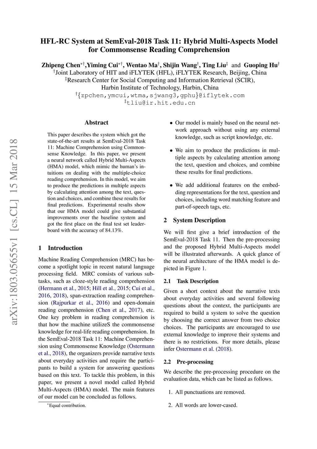 HFL-RC System at SemEval-2018 Task 11: Hybrid Multi-Aspects Model for