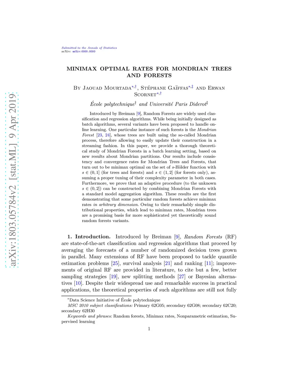 Introduced by Breiman, Random Forests are widely used classification and regression algorithms. While being initially designed as batch algorithms, several variants have been proposed to handle online learning. One particular instance of such forests is the \emph{Mondrian Forest}, whose trees are built using the so-called Mondrian process, therefore allowing to easily update their construction in a streaming fashion. In this paper, we provide a thorough theoretical study of Mondrian Forests in a batch learning setting, based on new results about Mondrian partitions. Our results include consistency and convergence rates for Mondrian Trees and Forests, that turn out to be minimax optimal on the set of -H\"older function with (for trees and forests) and (for forests only), assuming a proper tuning of their complexity parameter in both cases. Furthermore, we prove that an adaptive procedure (to the unknown ) can be constructed by combining Mondrian Forests with a standard model aggregation algorithm. These results are the first demonstrating that some particular random forests achieve minimax rates \textit{in arbitrary dimension}. Owing to their remarkably simple distributional properties, which lead to minimax rates, Mondrian trees are a promising basis for more sophisticated yet theoretically sound random forests variants.
