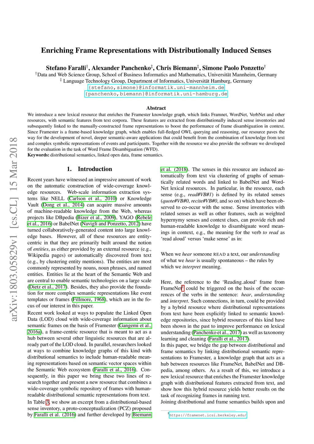We introduce a new lexical resource that enriches the Framester knowledge graph, which links Framnet, WordNet, VerbNet and other resources, with semantic features from text corpora. These features are extracted from distributionally induced sense inventories and subsequently linked to the manually-constructed frame representations to boost the performance of frame disambiguation in context. Since Framester is a frame-based knowledge graph, which enables full-fledged OWL querying and reasoning, our resource paves the way for the development of novel, deeper semantic-aware applications that could benefit from the combination of knowledge from text and complex symbolic representations of events and participants. Together with the resource we also provide the software we developed for the evaluation in the task of Word Frame Disambiguation (WFD).
