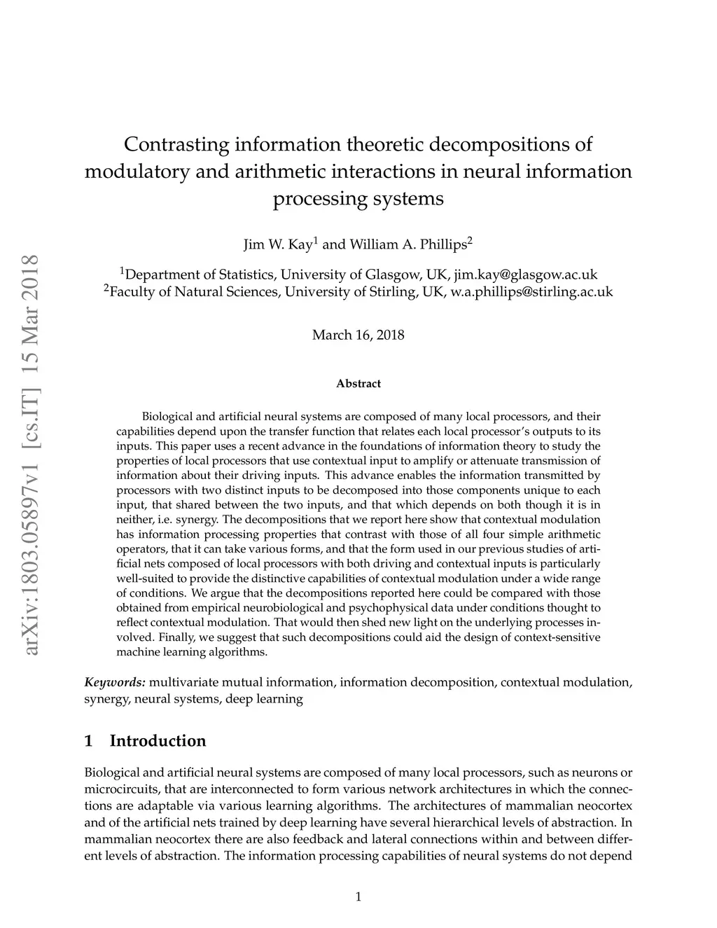 Biological and artificial neural systems are composed of many local processors, and their capabilities depend upon the transfer function that relates each local processor's outputs to its inputs. This paper uses a recent advance in the foundations of information theory to study the properties of local processors that use contextual input to amplify or attenuate transmission of information about their driving inputs. This advance enables the information transmitted by processors with two distinct inputs to be decomposed into those components unique to each input, that shared between the two inputs, and that which depends on both though it is in neither, i.e. synergy. The decompositions that we report here show that contextual modulation has information processing properties that contrast with those of all four simple arithmetic operators, that it can take various forms, and that the form used in our previous studies of artificial neural nets composed of local processors with both driving and contextual inputs is particularly well-suited to provide the distinctive capabilities of contextual modulation under a wide range of conditions. We argue that the decompositions reported here could be compared with those obtained from empirical neurobiological and psychophysical data under conditions thought to reflect contextual modulation. That would then shed new light on the underlying processes involved. Finally, we suggest that such decompositions could aid the design of context-sensitive machine learning algorithms.