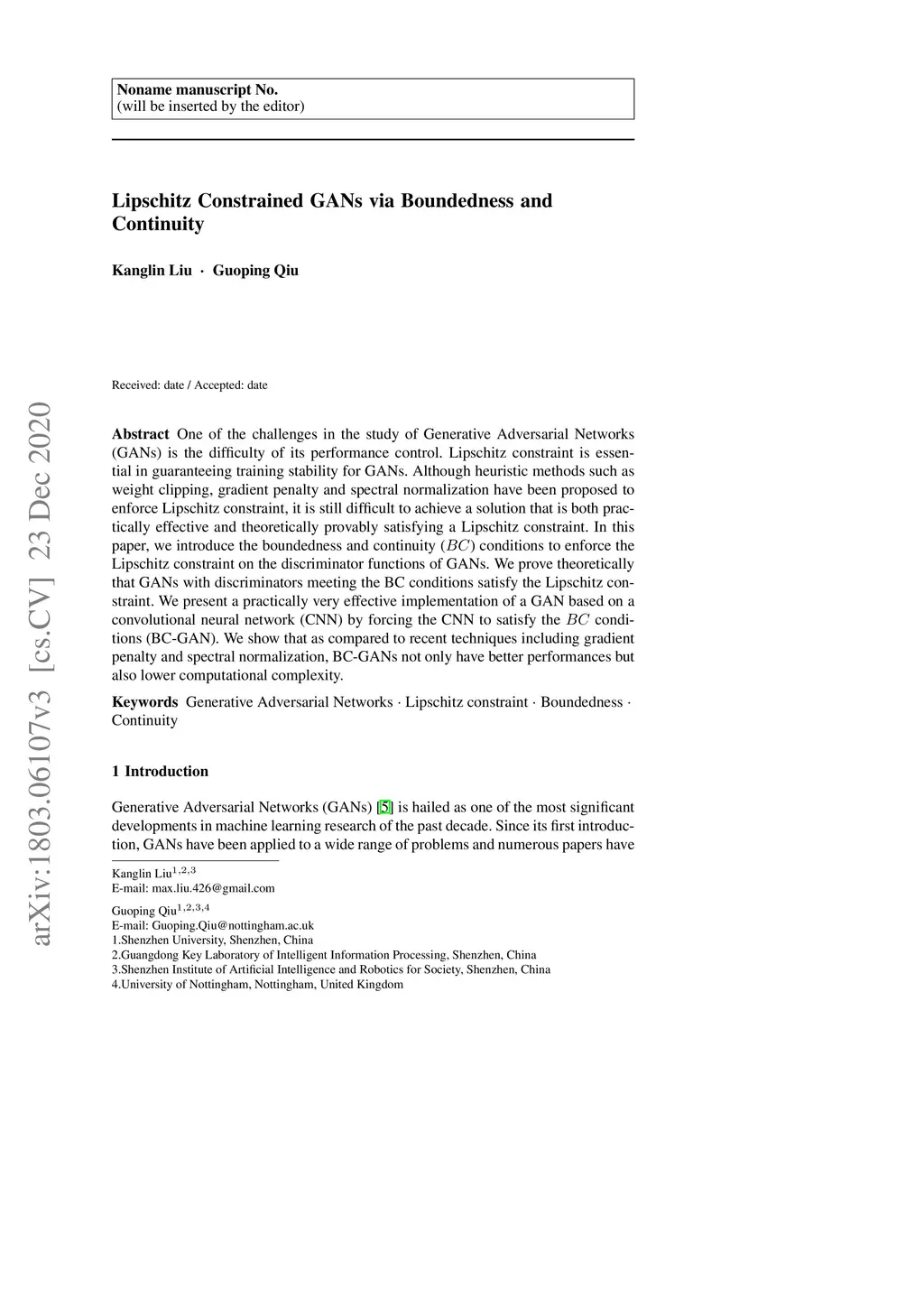 One of the challenges in the study of Generative Adversarial Networks (GANs) is the difficulty of its performance control. Lipschitz constraint is essential in guaranteeing training stability for GANs. Although heuristic methods such as weight clipping, gradient penalty and spectral normalization have been proposed to enforce Lipschitz constraint, it is still difficult to achieve a solution that is both practically effective and theoretically provably satisfying a Lipschitz constraint. In this paper, we introduce the boundedness and continuity () conditions to enforce the Lipschitz constraint on the discriminator functions of GANs. We prove theoretically that GANs with discriminators meeting the BC conditions satisfy the Lipschitz constraint. We present a practically very effective implementation of a GAN based on a convolutional neural network (CNN) by forcing the CNN to satisfy the conditions (BC-GAN). We show that as compared to recent techniques including gradient penalty and spectral normalization, BC-GANs not only have better performances but also lower computational complexity.