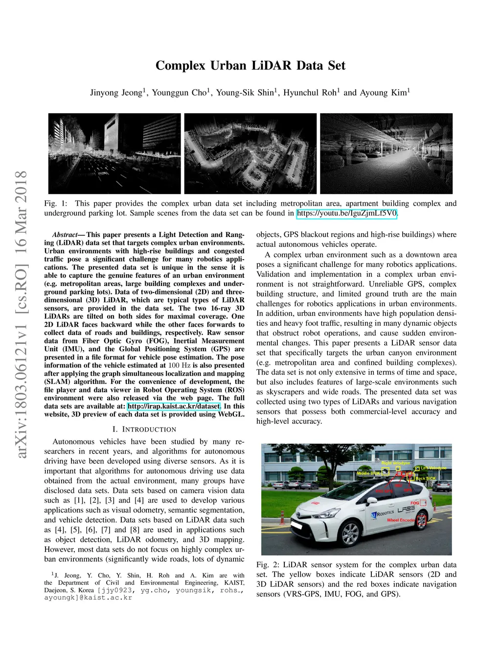 This paper presents a Light Detection and Ranging (LiDAR) data set that targets complex urban environments. Urban environments with high-rise buildings and congested traffic pose a significant challenge for many robotics applications. The presented data set is unique in the sense it is able to capture the genuine features of an urban environment (e.g. metropolitan areas, large building complexes and underground parking lots). Data of two-dimensional (2D) and threedimensional (3D) LiDAR, which are typical types of LiDAR sensors, are provided in the data set. The two 16-ray 3D LiDARs are tilted on both sides for maximal coverage. One 2D LiDAR faces backward while the other faces forwards to collect data of roads and buildings, respectively. Raw sensor data from Fiber Optic Gyro (FOG), Inertial Measurement Unit (IMU), and the Global Positioning System (GPS) are presented in a file format for vehicle pose estimation. The pose information of the vehicle estimated at 100 Hz is also presented after applying the graph simultaneous localization and mapping (SLAM) algorithm. For the convenience of development, the file player and data viewer in Robot Operating System (ROS) environment were also released via the web page. The full data sets are available at: http://irap.kaist.ac.kr/dataset. In this website, 3D preview of each data set is provided using WebGL.